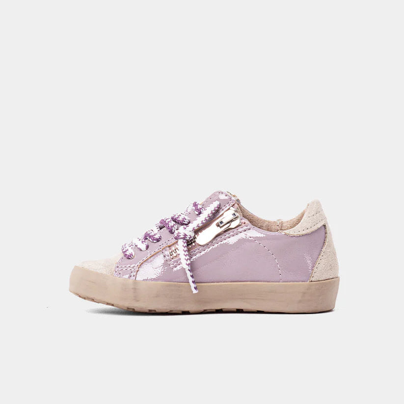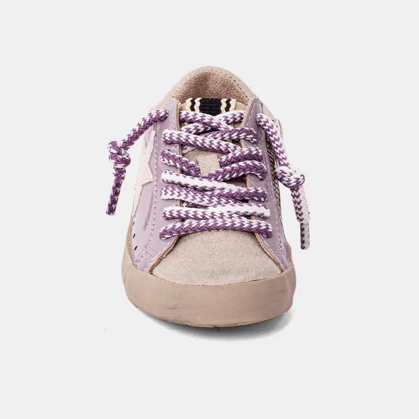 Give her style a soft statement with the PAULA MINI in Lavender. Designed for little fashion lovers, this sneaker features a two-tone faux leather upper in dusty lavender and blush pink, brought to life with a metallic pink star and a soft suede toe cap. Chunky lavender-and-white striped laces and a side zipper (in toddler sizes only) make getting ready fun and easy. Just like the grown-up version, but made for minis with comfort in every step.