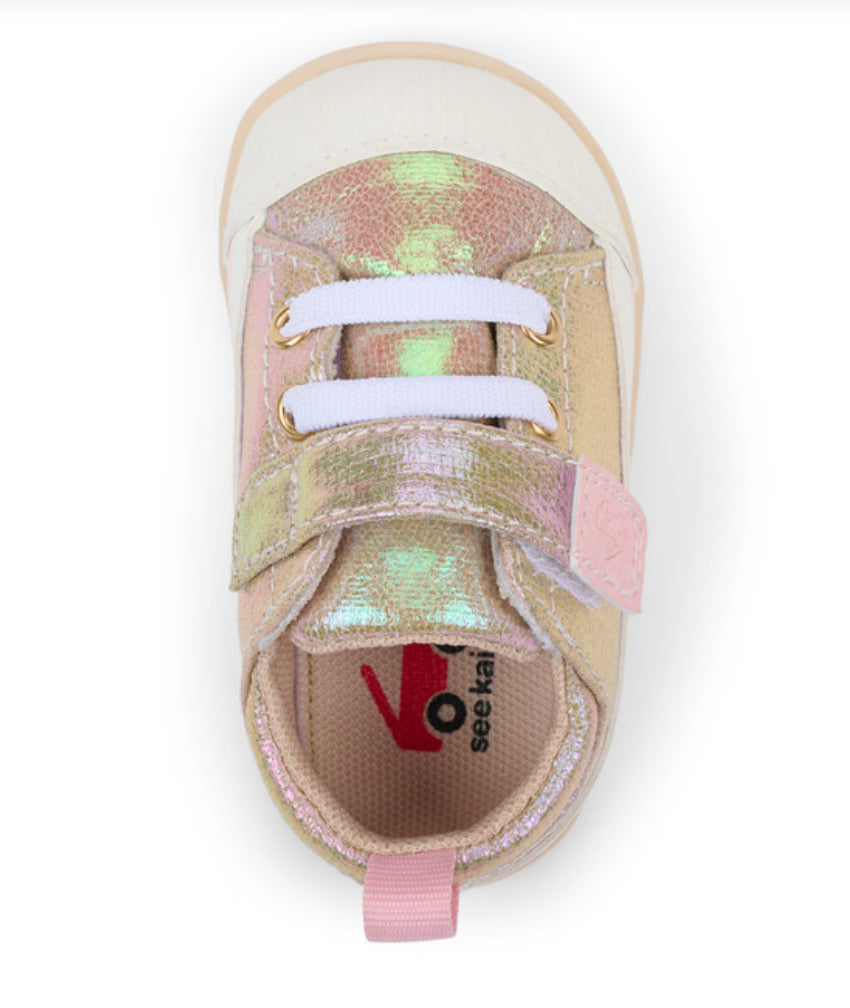- Gold metallic shimmer textile upper with nubuck-feel detail and rubberized toe cap to protect little toes.