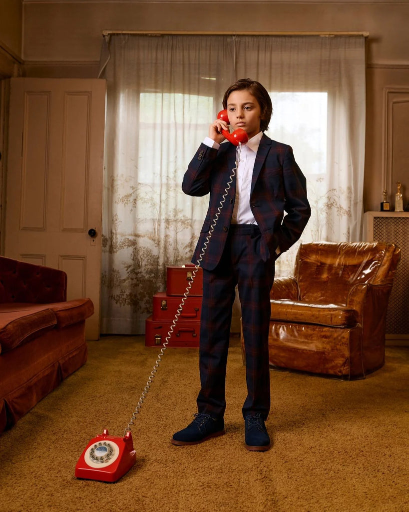 Step up your kid’s suit game with the Stretchy Mod Suit in Navy/Cranberry Plaid! This dapper combo is where style meets comfort, featuring a bold plaid pattern and fine tailoring for a polished look that’s perfect for every occasion. The suit’s stretchy fabric keeps kids comfy, while the adjustable waist ensures a just-right fit. Details like a red interior lining, handy interior pockets, and a pop-of-color pocket square add extra flair. From school recitals to family celebrations, this suit’s versatility shines. Easy-to-use buttons make dressing a breeze, so your little trendsetter can focus on stealing the spotlight in style!