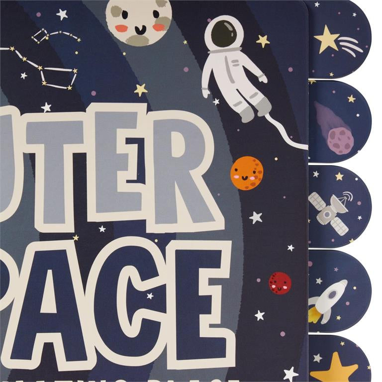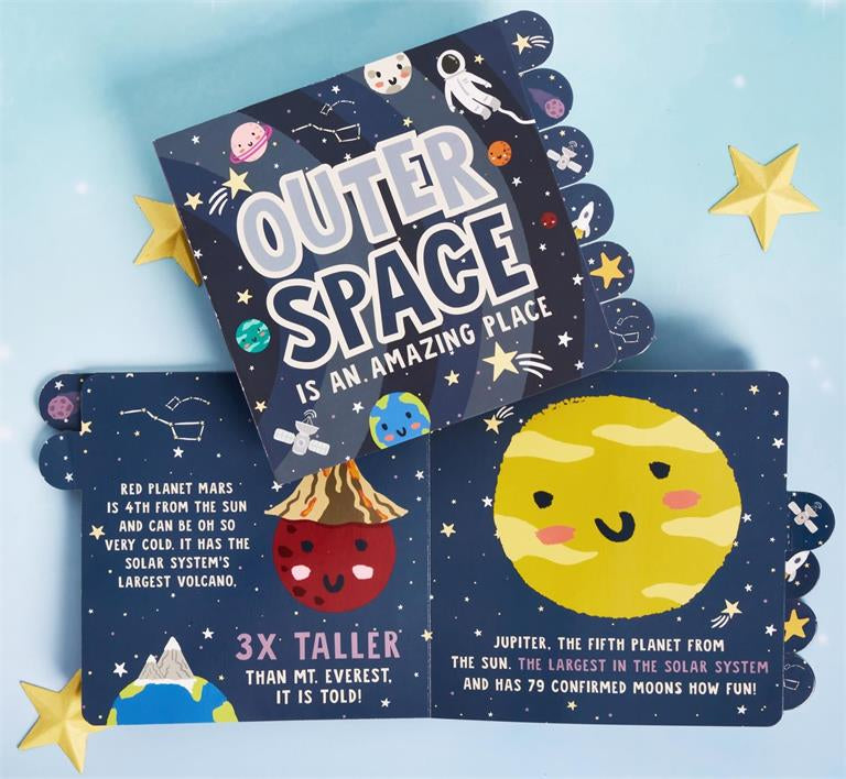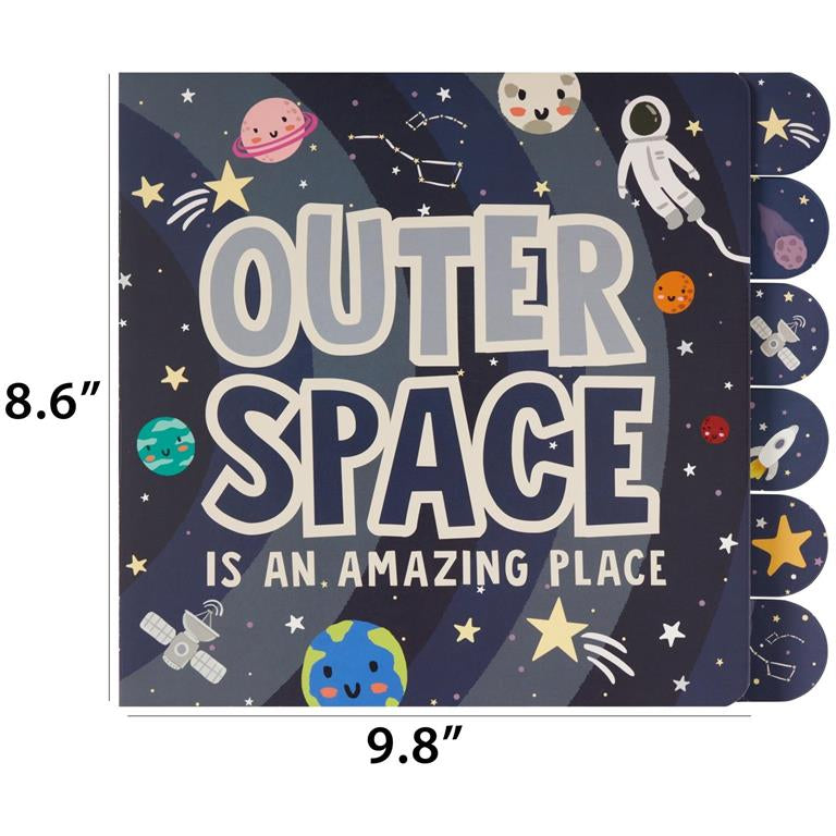 Let's Explore with our new Outer Space tabbed board book. Children can learn fun facts about outer space and our solar system throughout the 6 tabbed pages. CRGibson Signature original illustrations and story.