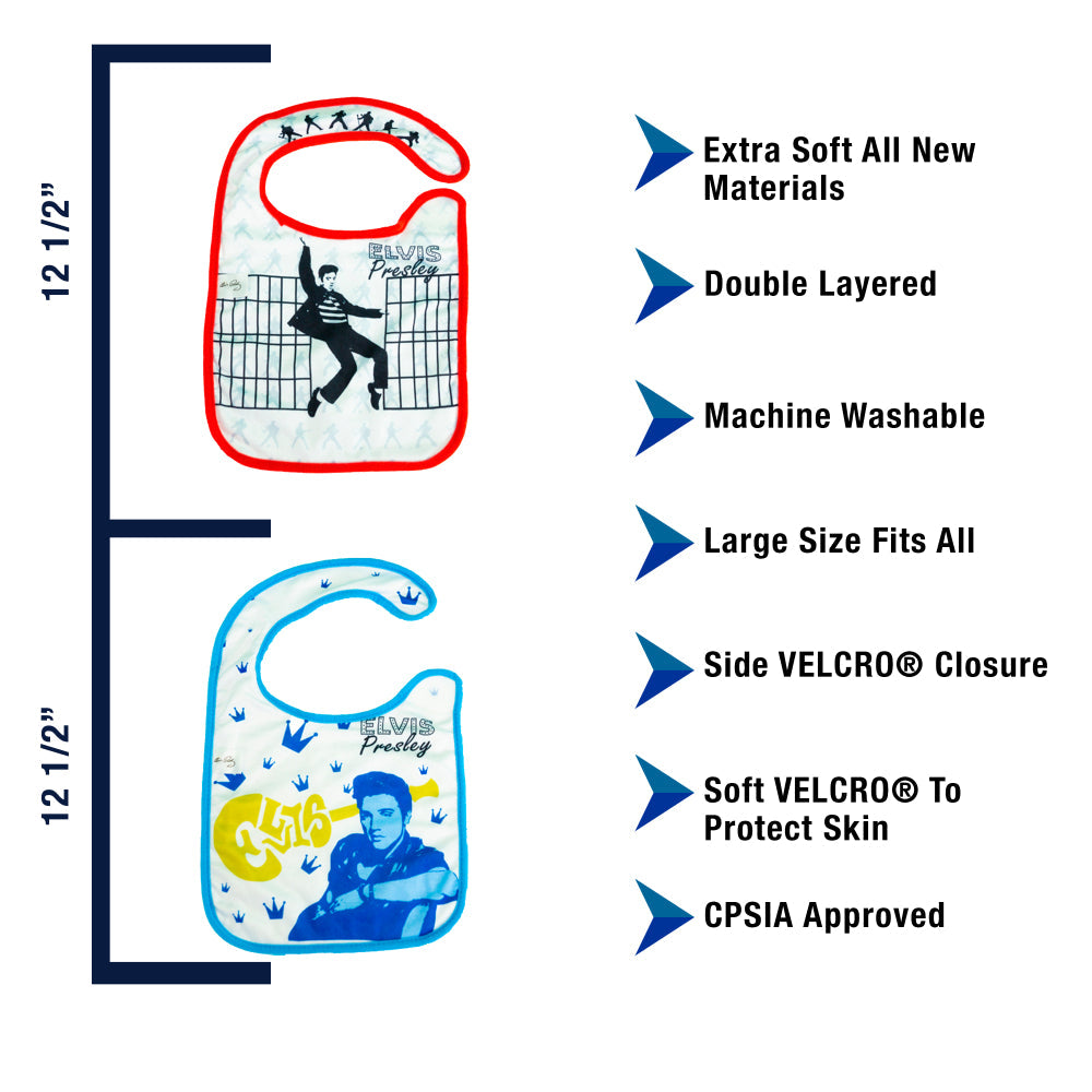 "Bring the king home with the Elvis bibs 2 pack. Featuring both the Love Me Tender and Jailhouse Rock designs, these bibs celebrate an icon all while protecting your young one's clothes with one of the soft cotton bibs.