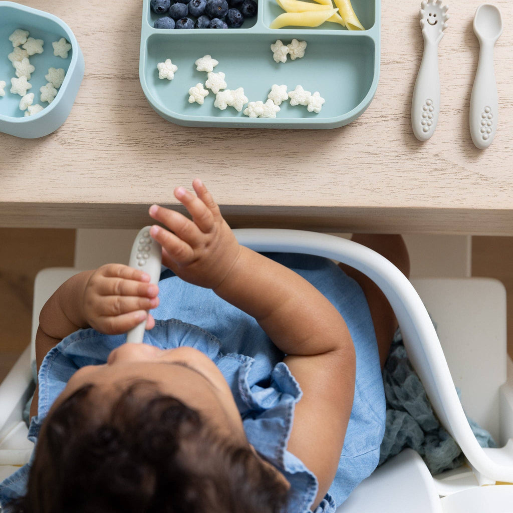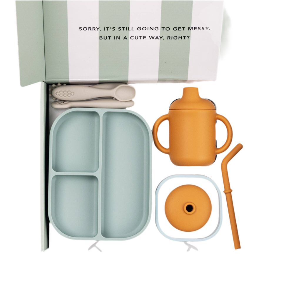 Ready, set, eat! Introducing our expert-approved toolkit of mealtime essentials for baby’s first food and drink! This set is the perfect new baby gift and a parent must-have. Each set includes all of the products needed for the first moment of introducing solids to little ones. Each product is designed to be used from parent led weaning or baby led weaning to independent eating. One set includes everything you need: 1 cup, 2 lids, 3 utensils, 1 suction plate, and 1 starter bowl in a ready-to-gift box (10.75" x 8.75" x 2.75").