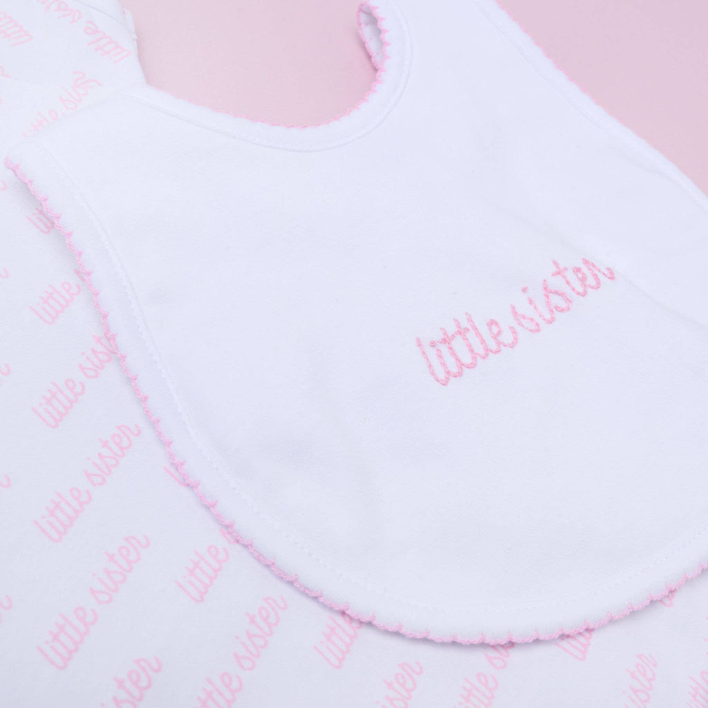 Carefully crafted from luxurious Pima cotton, this exquisite bib is gentle on your little one's delicate skin. Adorned with sweet pink picot trim and a lovely hand-embroidered Little Sister motif at its heart, this charming piece is both stylish and functional, keeping your baby's outfits spotless during mealtimes.