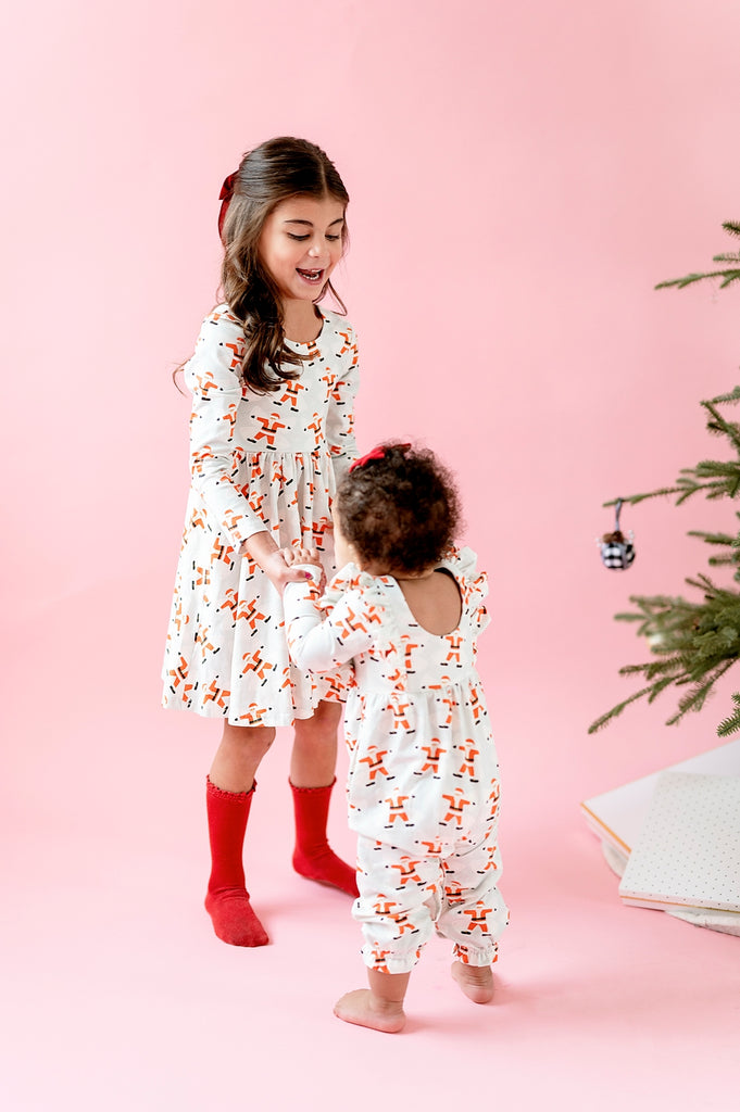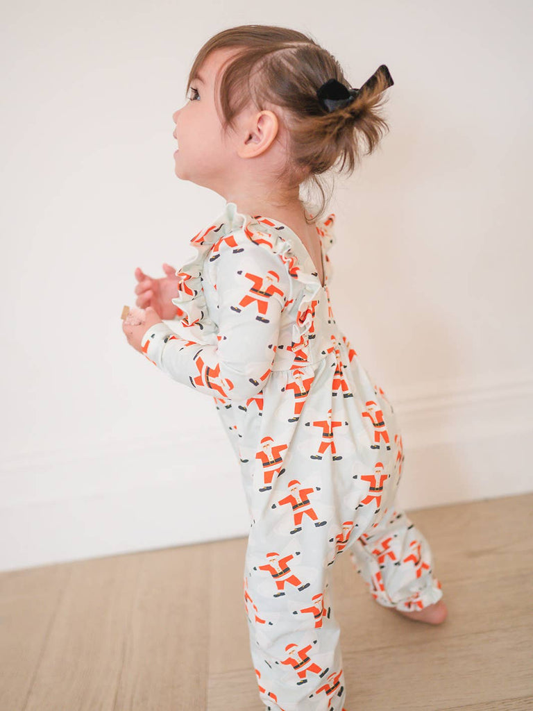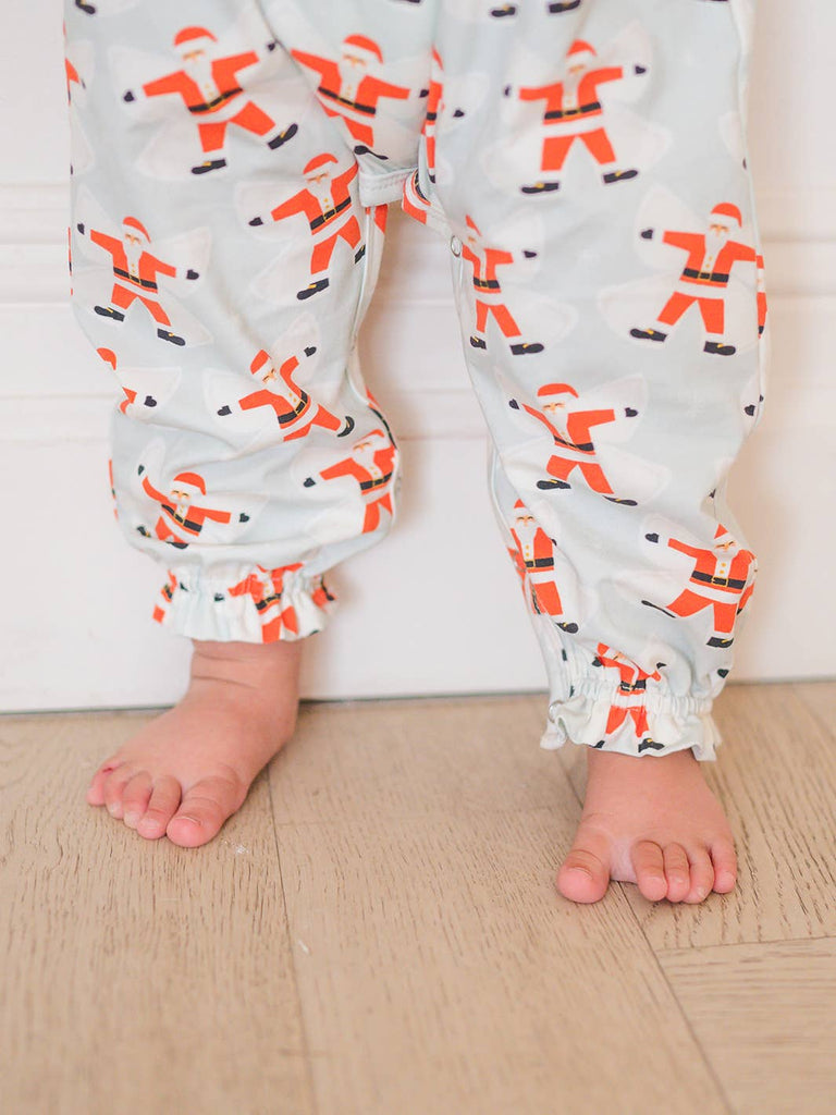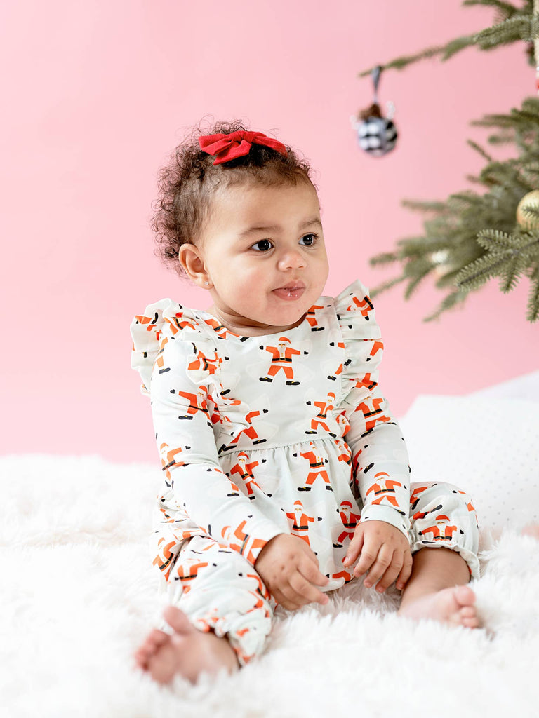 Our Mabel Romper features a ruffled detail in front and back, long sleeves and snap closures around the inside legs for easy diaper changes. The Santa Angels print by Black Lamb Studio is a fun and festive way to celebrate the season!