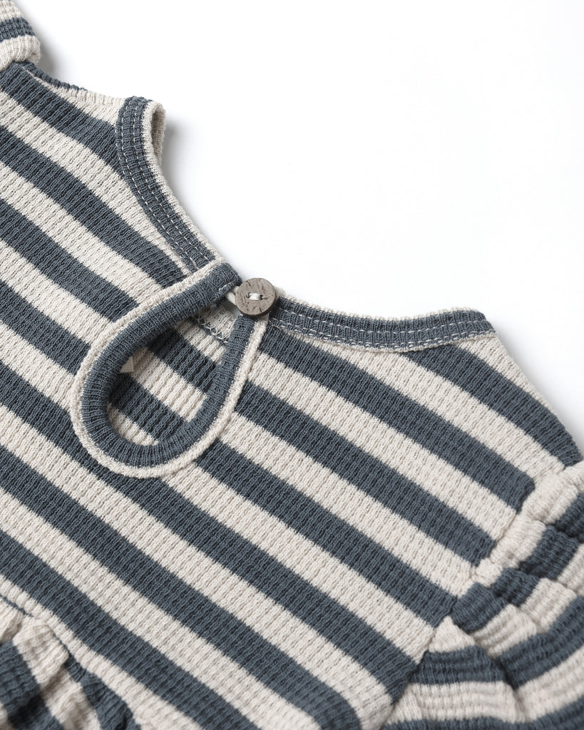 Our waffle knit Darla Dress features a babydoll silhouette with an empire waist, balloon sleeves, and a coconut button keyhole at the back. Coordinating bloomers included with all sizes.
