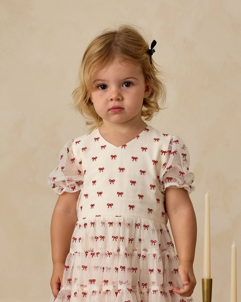This dreamy midi-length dress is crafted from flocked dotted tulle and features a four-tiered skirt made for twirling, full puffed sleeves, and a delicate button-back closure. Coordinating bloomers included with size 2Y.