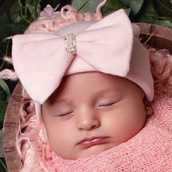 Pink Nursery Hat with Pink Bow. This hat features a Pearl Rhinestone Center in the middle of the bow.