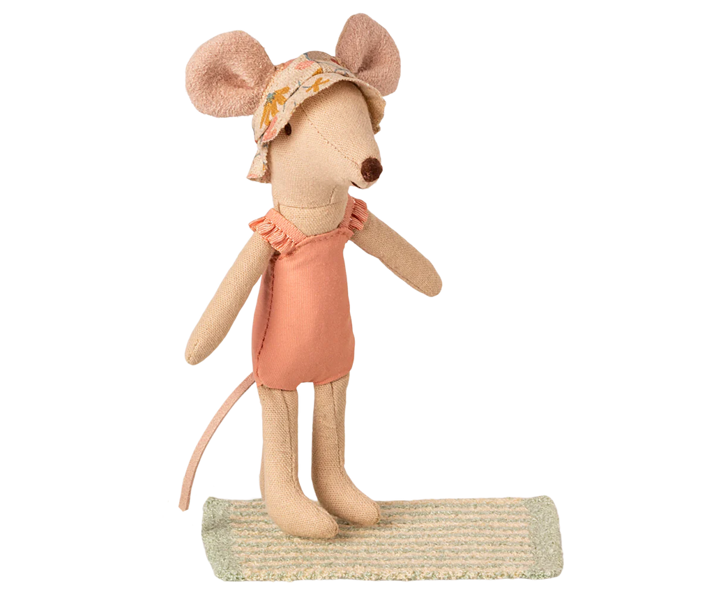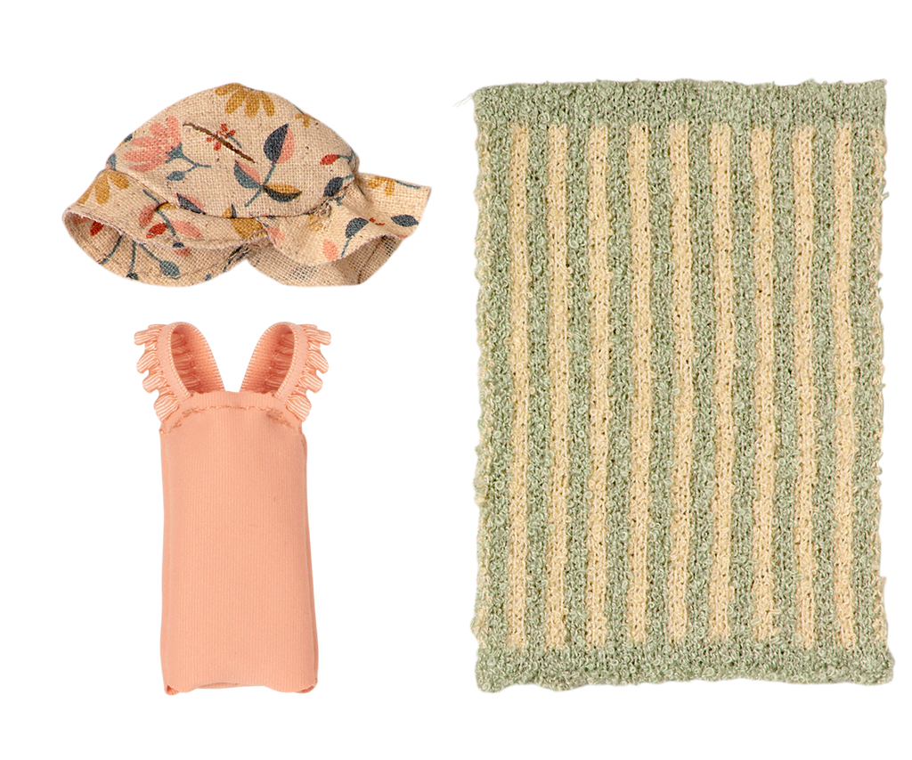 Vacation time! This set includes all essential accessories for a fun day at the beach: a bathing suit, sunhat, and a towel. It all fits the mice in size big brother/sister perfectly.