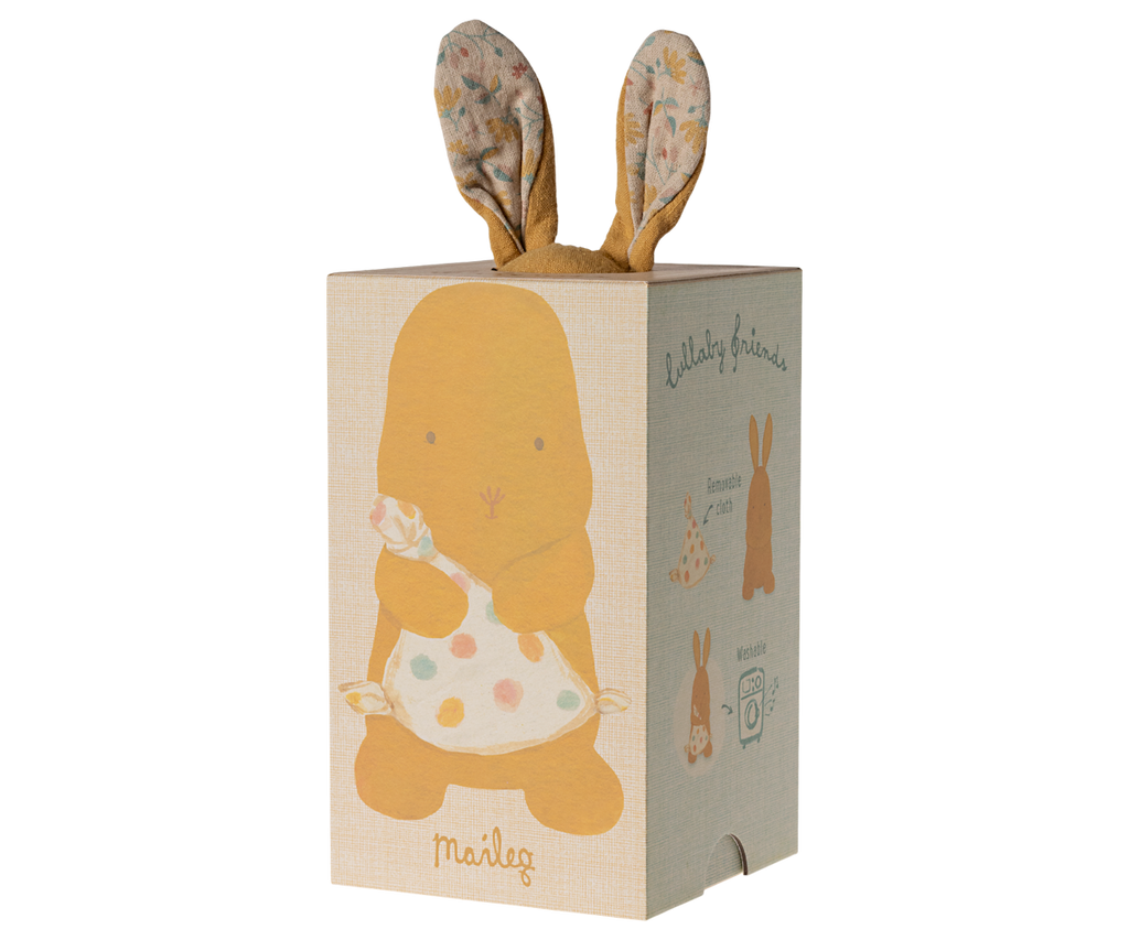 Lullaby friends is a collection of beautiful items for babies. This bunny has a soft cuddle cloth and will play a calm lullaby when you pull the tail. It is made in soft fabrics with unique prints and packed in a beautiful gift box.
