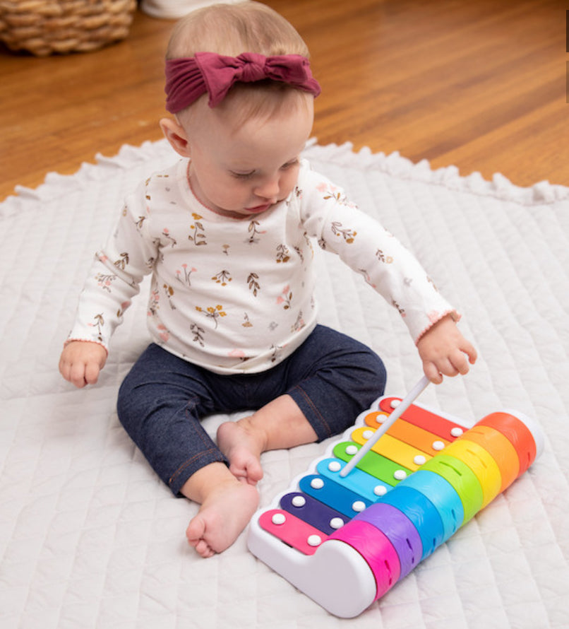 The included mallet lets little ones bang out tunes both wild and wonderful. Or, flip to the other side and spin the wheels. Each note rings beautifully!
