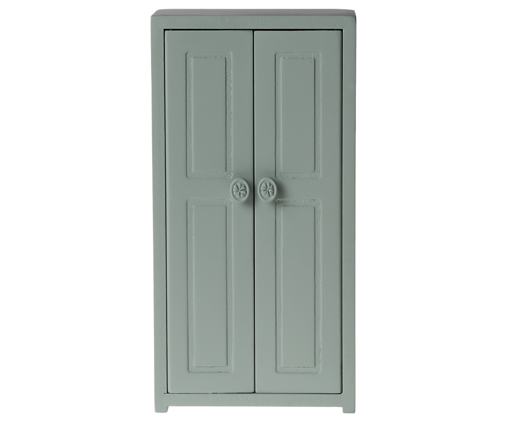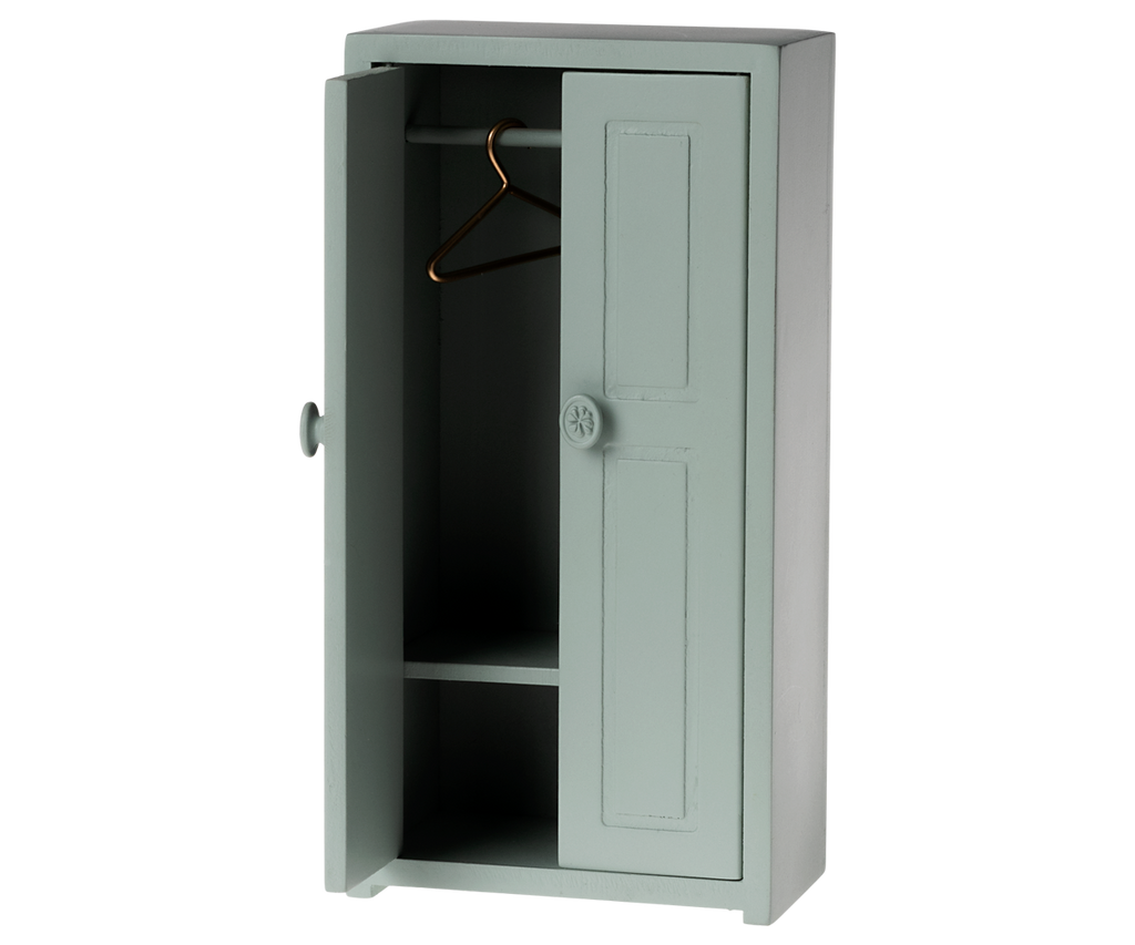 A small closet helps the mice family organize their wardrobe. The closet comes with three golden hangers.
