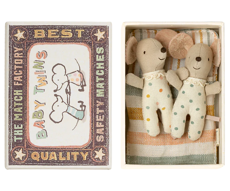A classic Maileg item. These baby twin mice sleep safely in their sleeping bag side by side, tucked in the matchbox bed. These mice fit all accessories in size baby mouse. Fabric may vary.