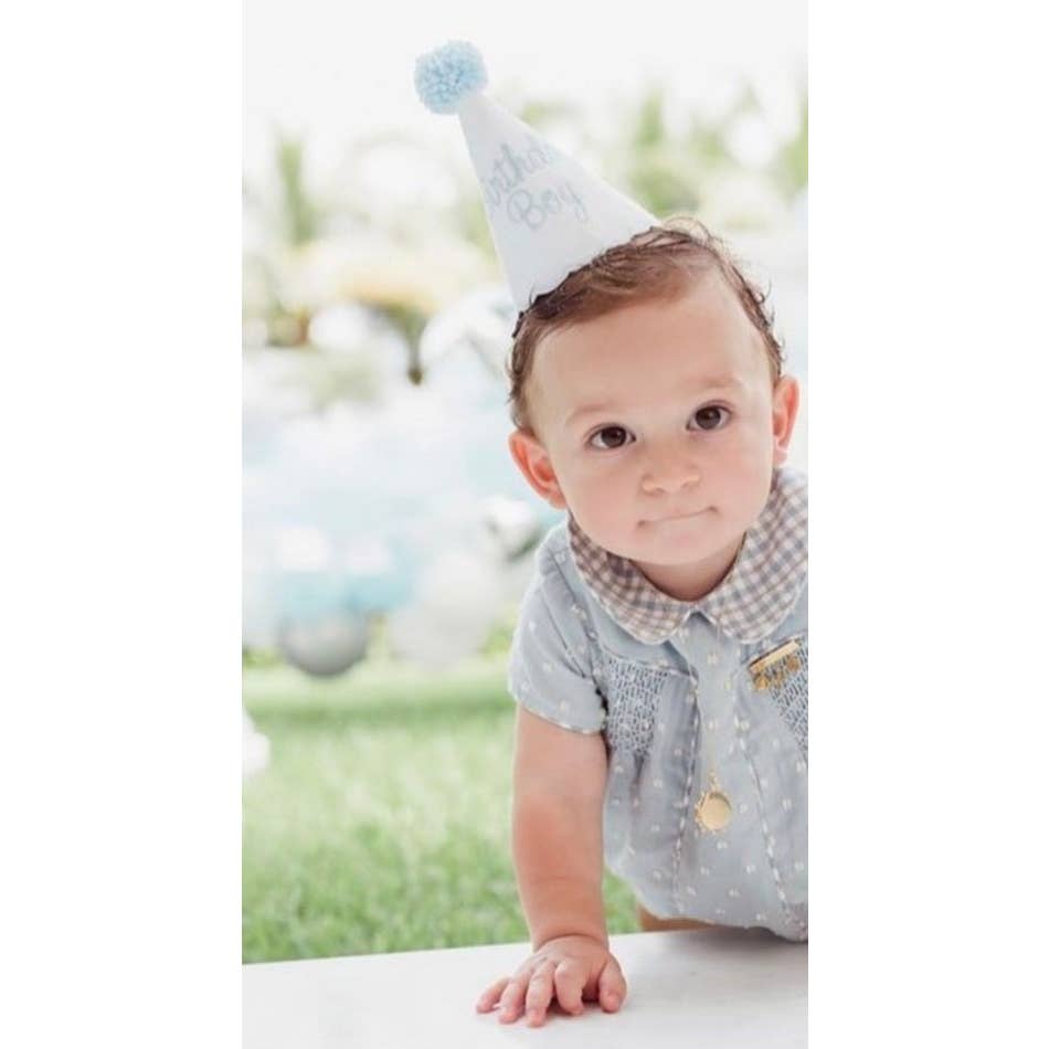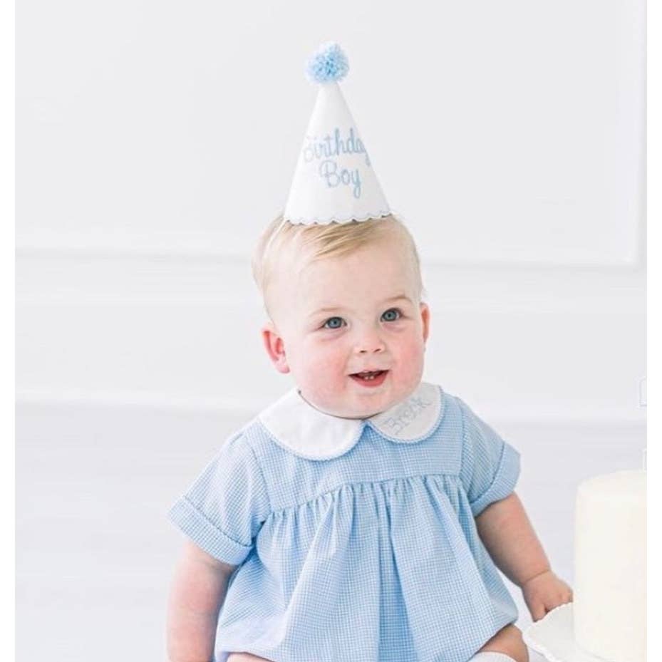 Whether your customers are shopping for a party hat that can be used for several years or a sweet baby gift, this best-selling hat is highly recommended. Our birthday boy hat features crisp white linen with soft blue embroidery, perfect for a variety of party themes and easy to coordinate with different outfits. The birthday boy keepsake party hat features our signature vintage scalloped edging and handcrafted pom topper.
