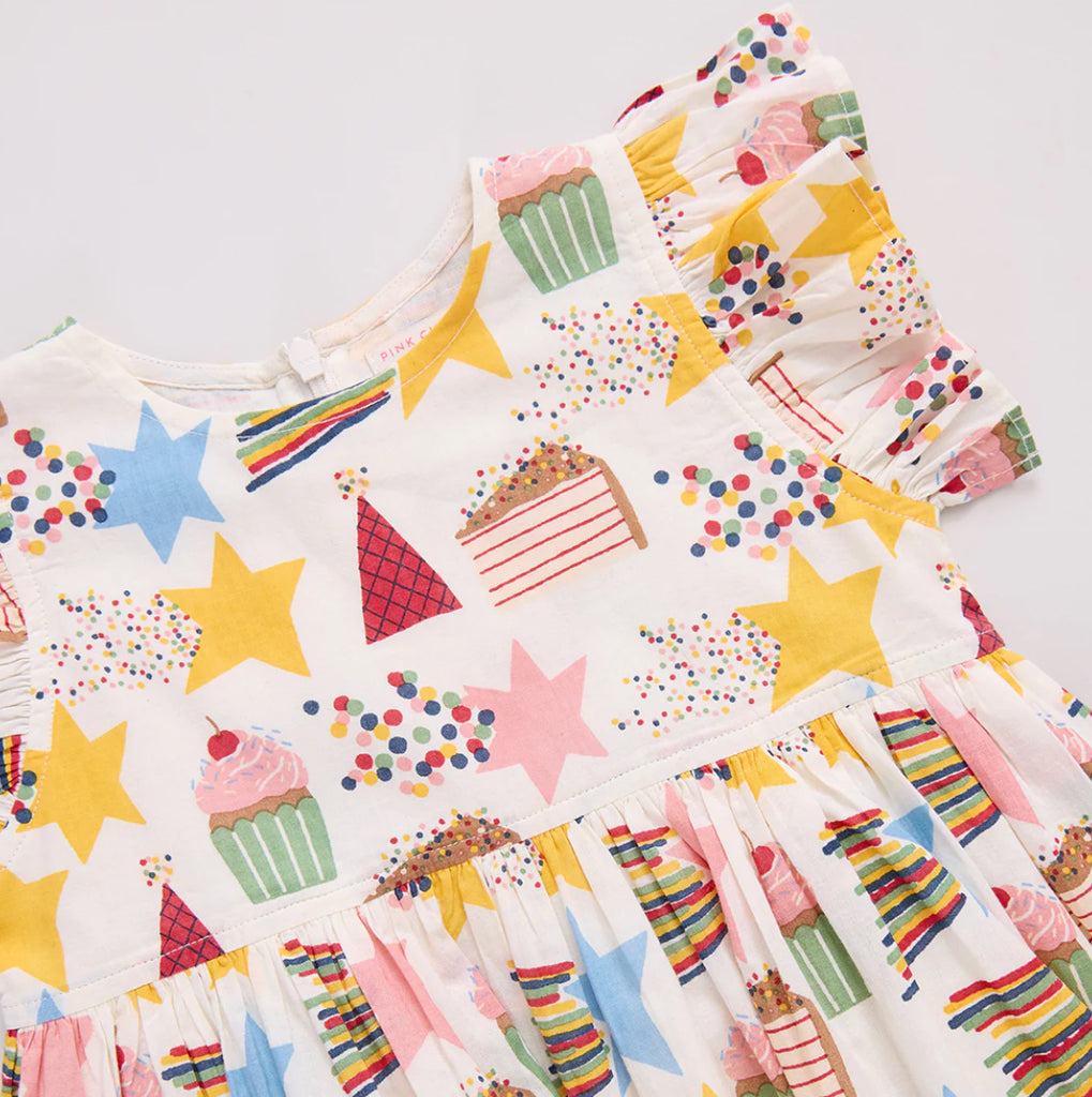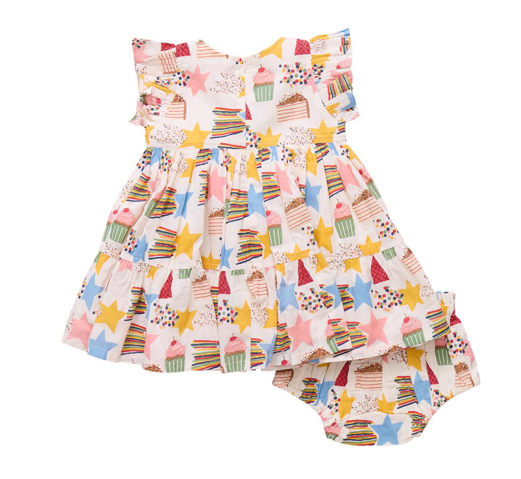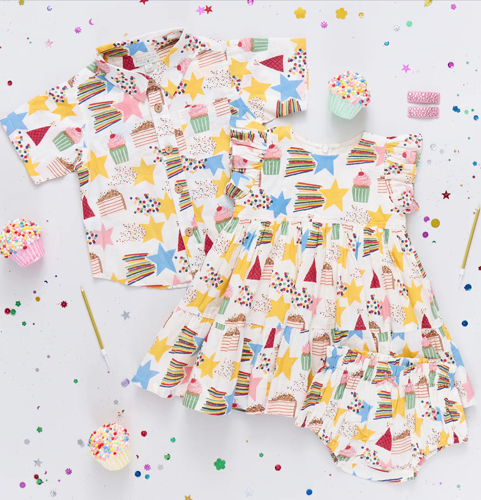 Cel-e-brate Good Times! Artist Charlotte Janvier pulls out all the stops in her fabulously festive Birthday Star print shown here on our Baby Girls Jennifer Dress Set.