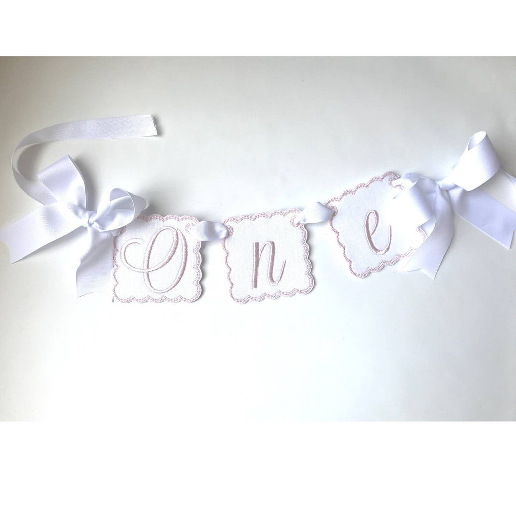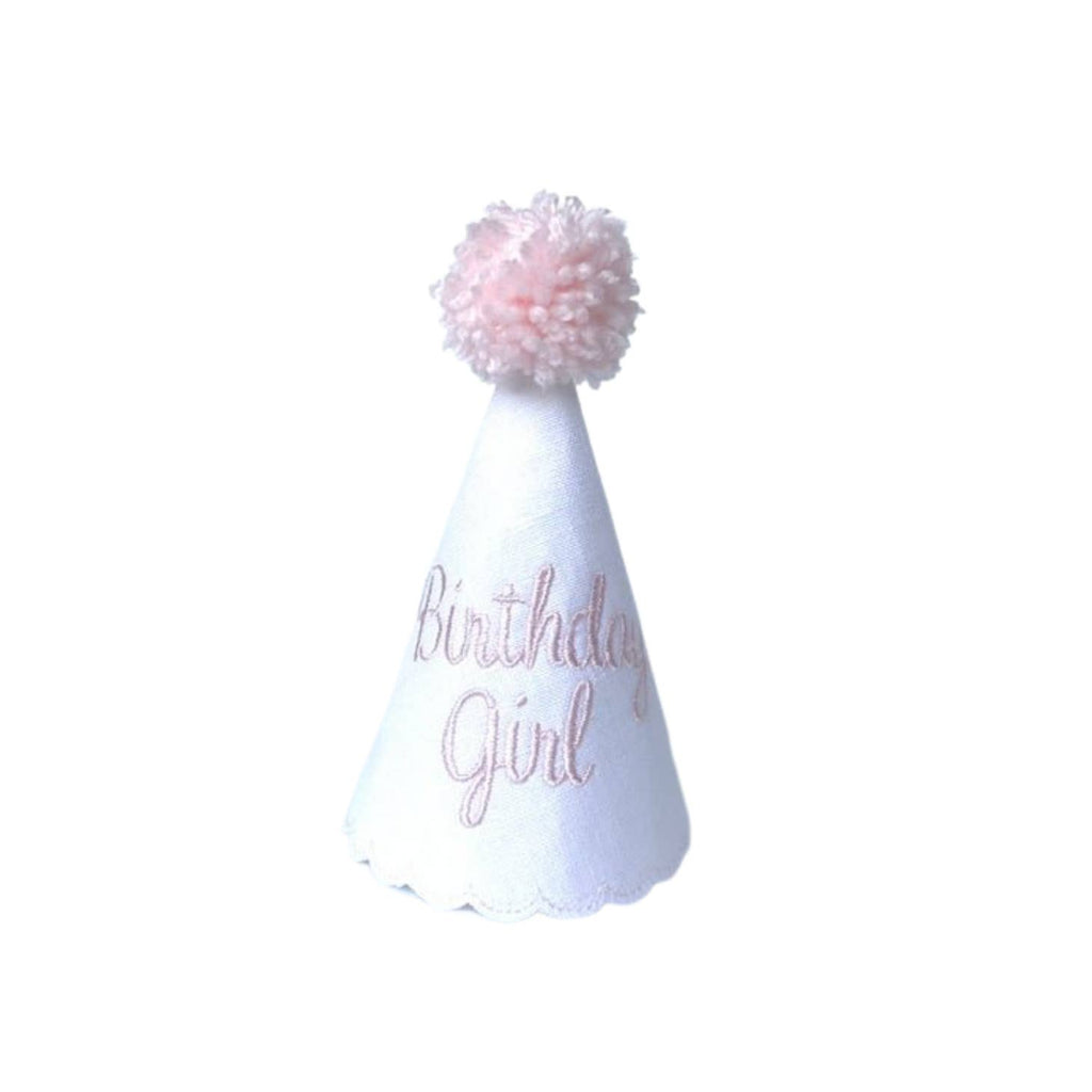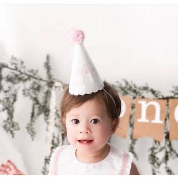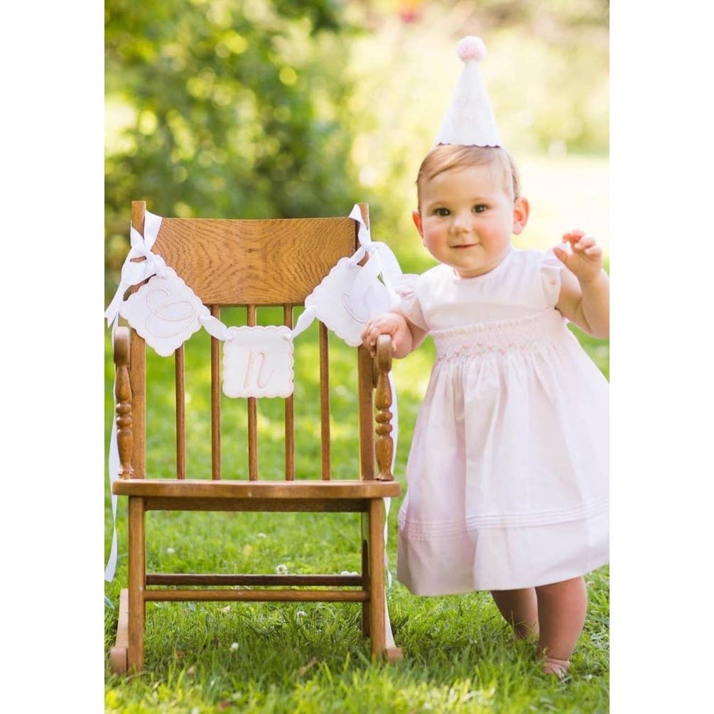Our retailers love this party set. The crisp white linen and soft blush pink embroidery make it easy to coordinate with a variety of outfits and themes. Our birthday girl 3 piece party set includes the following: * Keepsake party hat * Highchair banner with luxe bows * Keepsake "1" cake topper Each piece features delicate details like scalloped edging and vintage-inspired stitching.