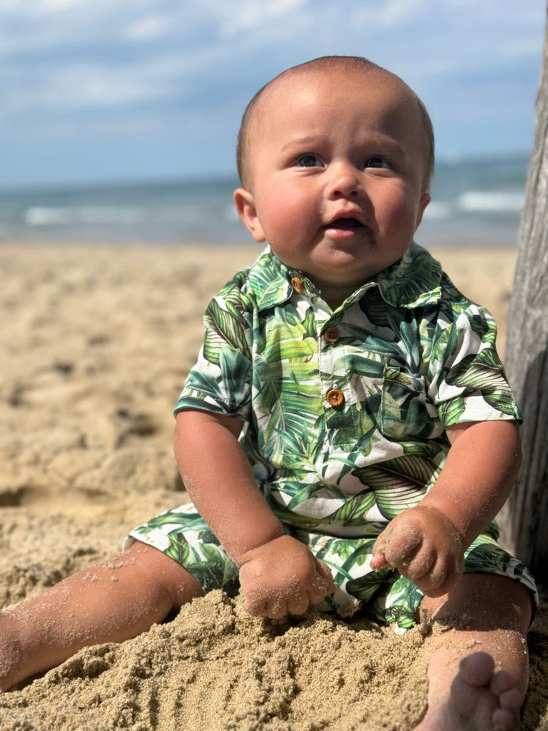 This sweet cotton romper will look amazing in any summertime photo. The romper has functional buttons down the henley style placket and a collar. The leg opening has snaps for easy diaper changes. Your little one will look stylish all season!