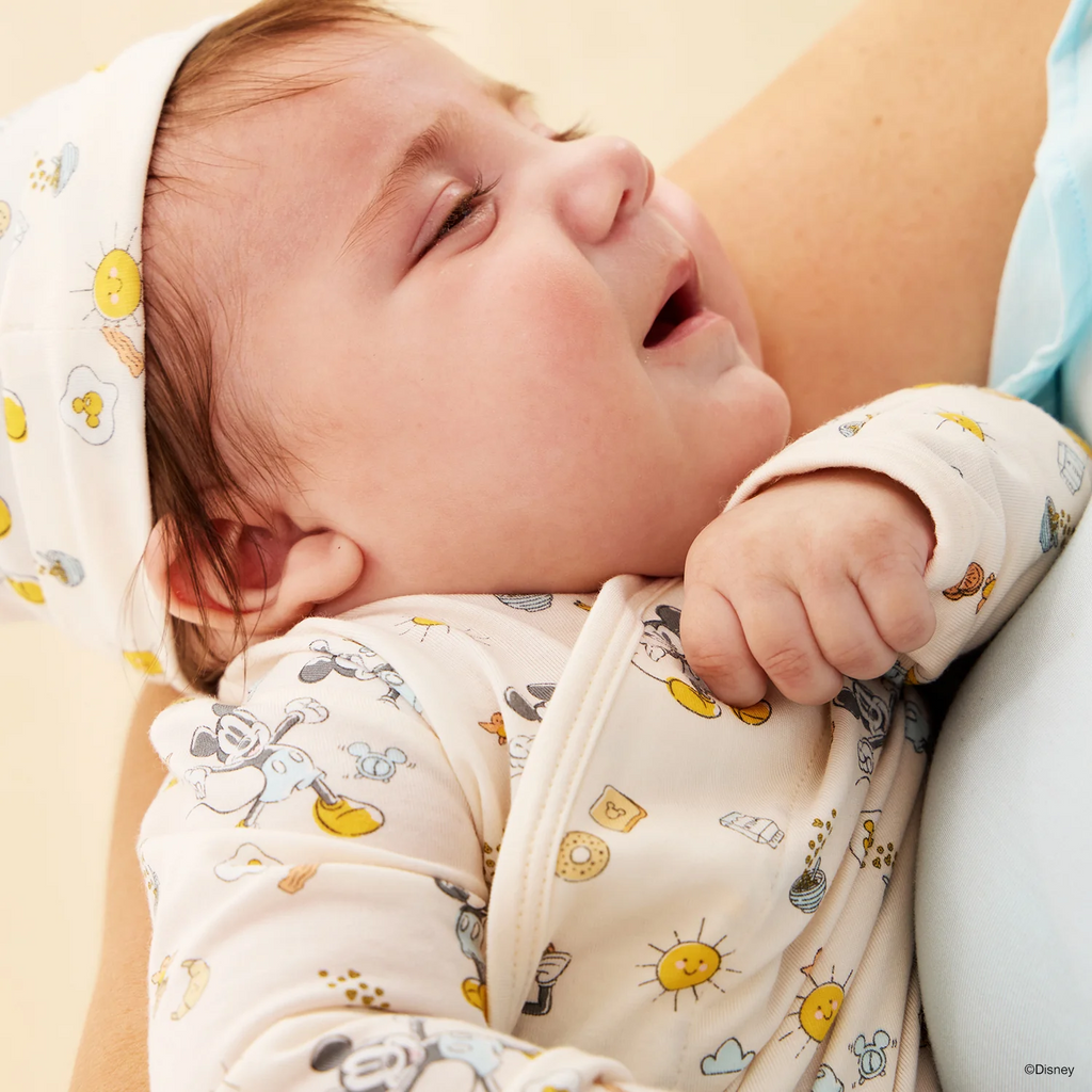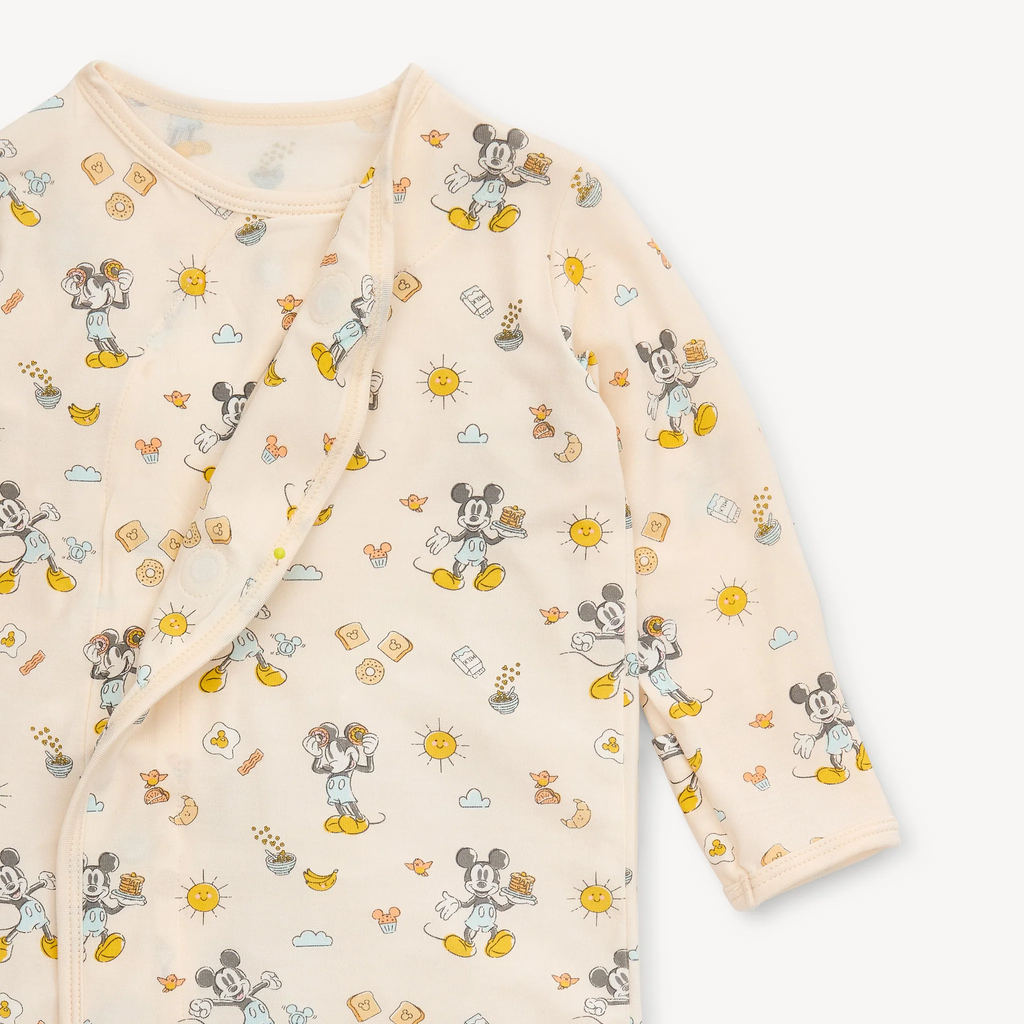 In this brunch club, you don't need a reservation—on the menu, Disney's Mickey Mouse eggs and toast and oh-so-soft magnetic pjs. the cozy sleeper gown + hat set is a wardrobe staple for newborns who require constant diaper changes (aka all of them). with magnets down the front, baby stays in the gown during the diaper switcheroo: separate magnets, put on a freshy, click magnets, done. other amazing features: eco-friendly TENCEL™ modal fabric and built-in mitten cuffs.