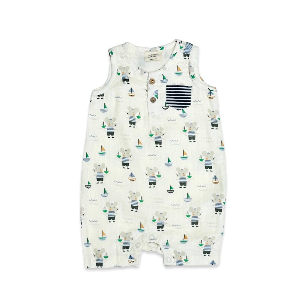 Sleeveless organic muslin short baby romper with buttons and pocket.