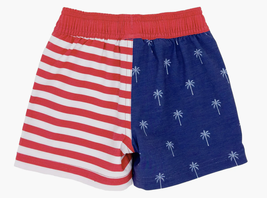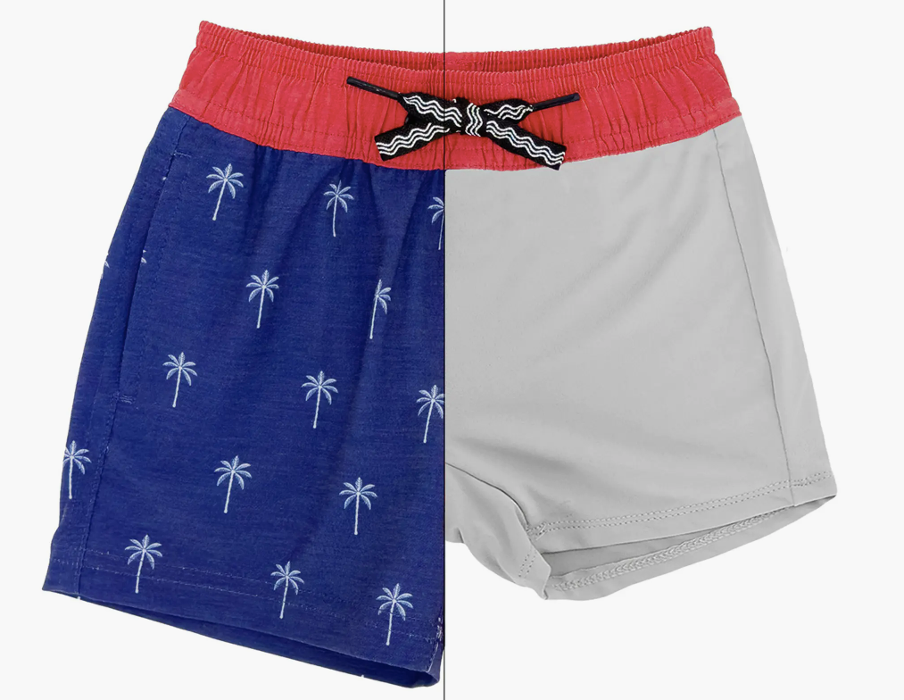 Four-way-stretch fabric with sun protection stays comfortable in the water and on land in kid-sized board shorts detailed with a cool color-blocked print.