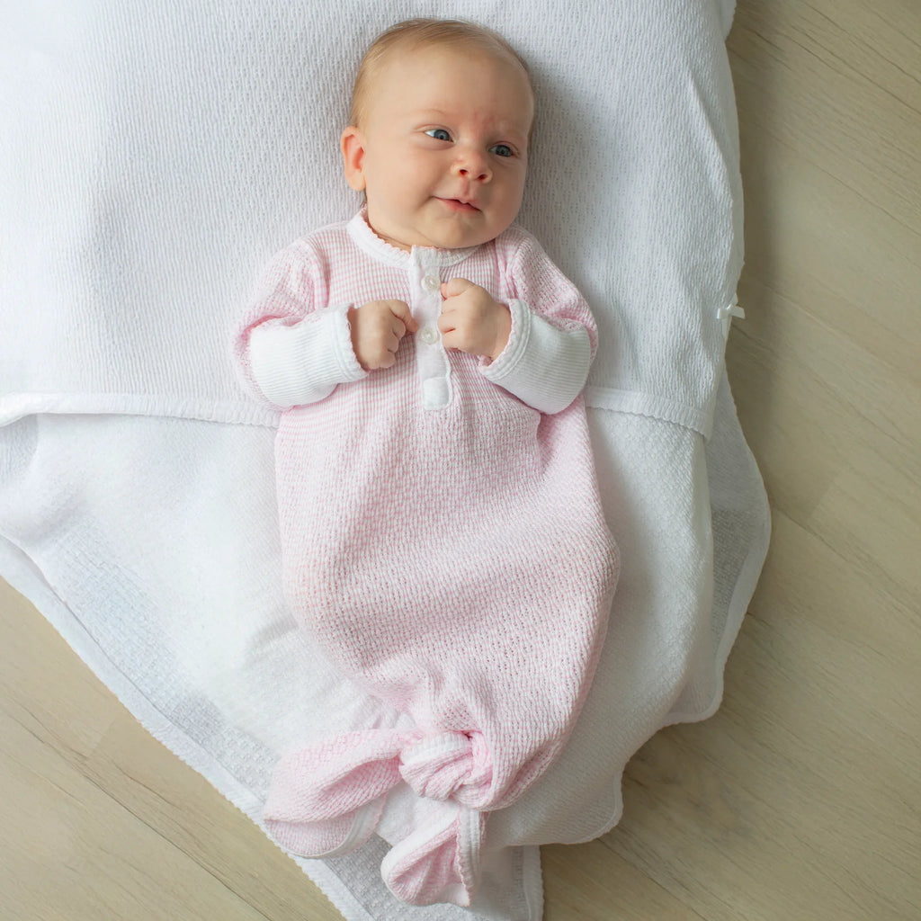The knotted bottom allows for easy diaper changes, while the gentle stretch ensures a cozy fit for newborns. Made from our signature soft and breathable Paty knit, this gown features delicate pink and blue colorways for a sweet touch.