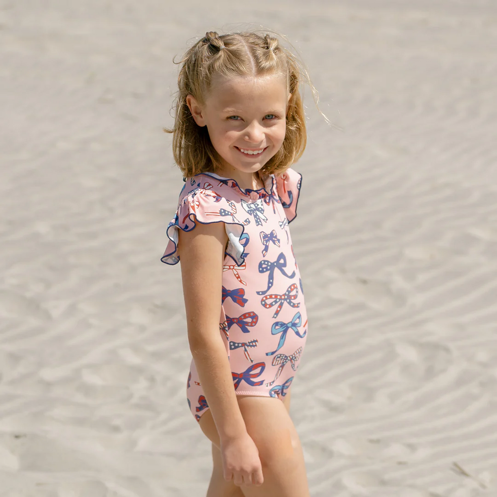 Summer Splash! An array of perfectly tied ribbons in shades of red, white and blue give a nod to the Stars and Stripes in our Pink Patriotic Bows conversation print shown here on our swan-dive-ready Girls Jennifer Suit. Now crafted in a boosted 50+ SPF material, this delightful one-piece features a navy accented ruffle collar and sleeve. A 3/4 zipper closure at the back, with an easy to grab colored pull rounds out the look.