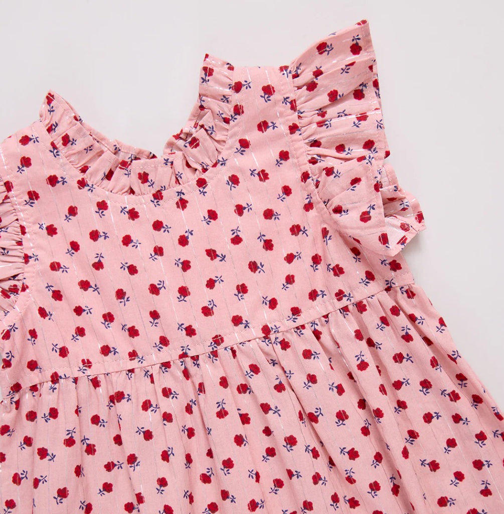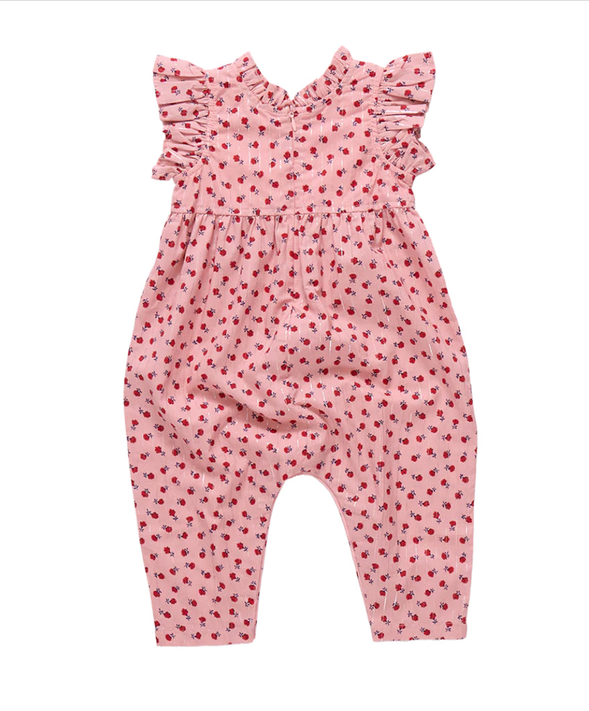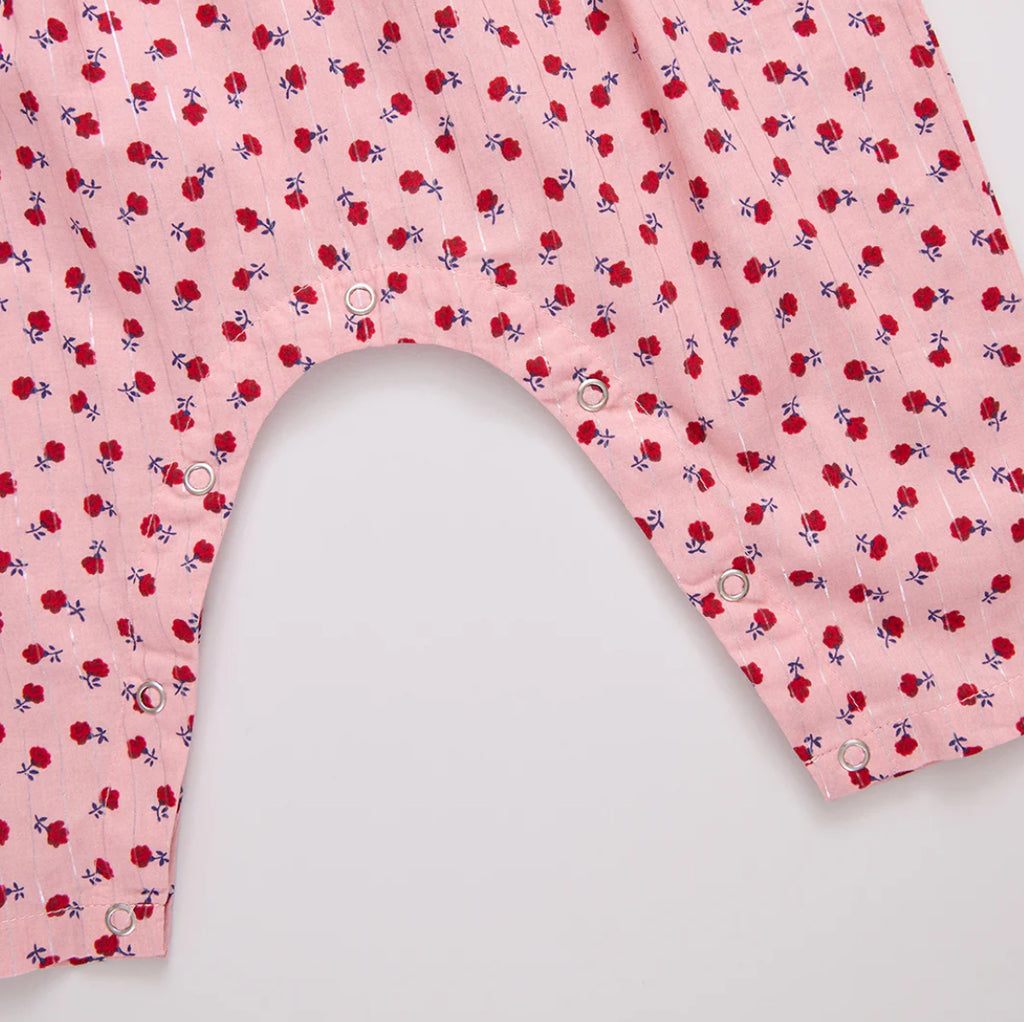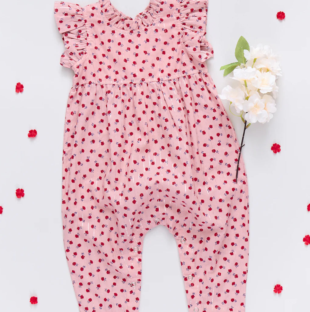 Feeling Rosy! Our delightful Pink Tiny Roses ditsy print tells a charming story on our Baby Girls Jennifer Jumper. Simple and sweet, this crisp one-piece feels at home on both playdates and weekend walks with the grandparents. Design highlights include a feminine ruffle sleeve and neck, and a shimmery accent with silver lurex thred woven throughout. Invisible zipper at the back. Ring snap closure at the legs for easy diapering.