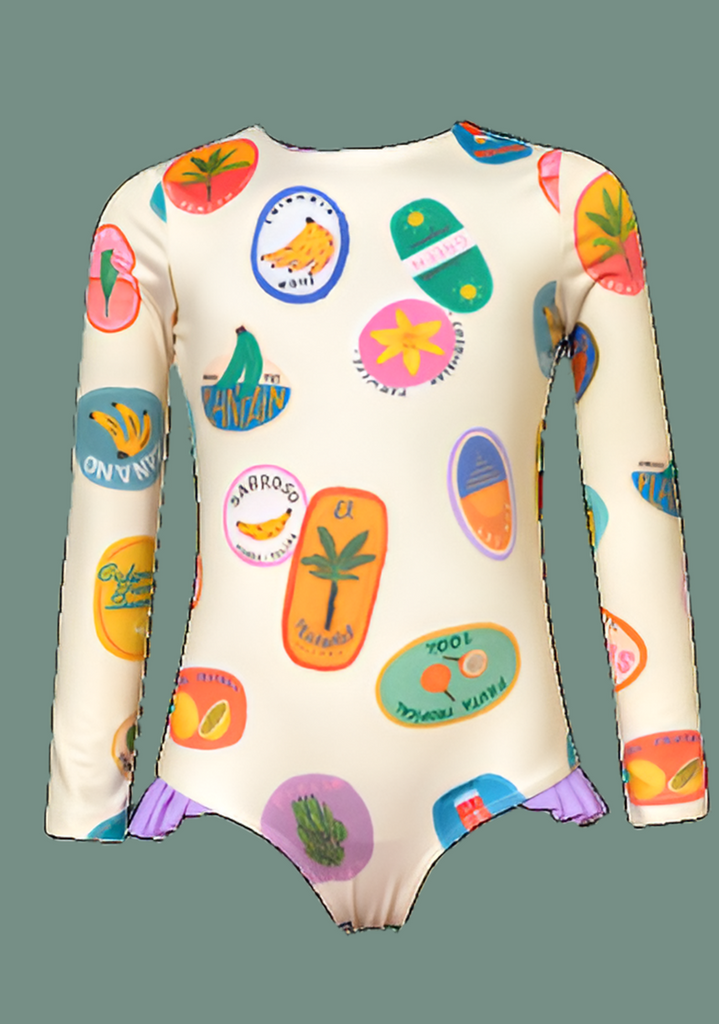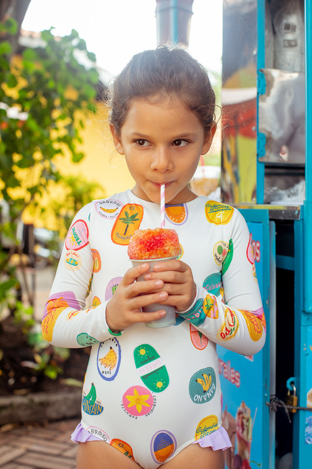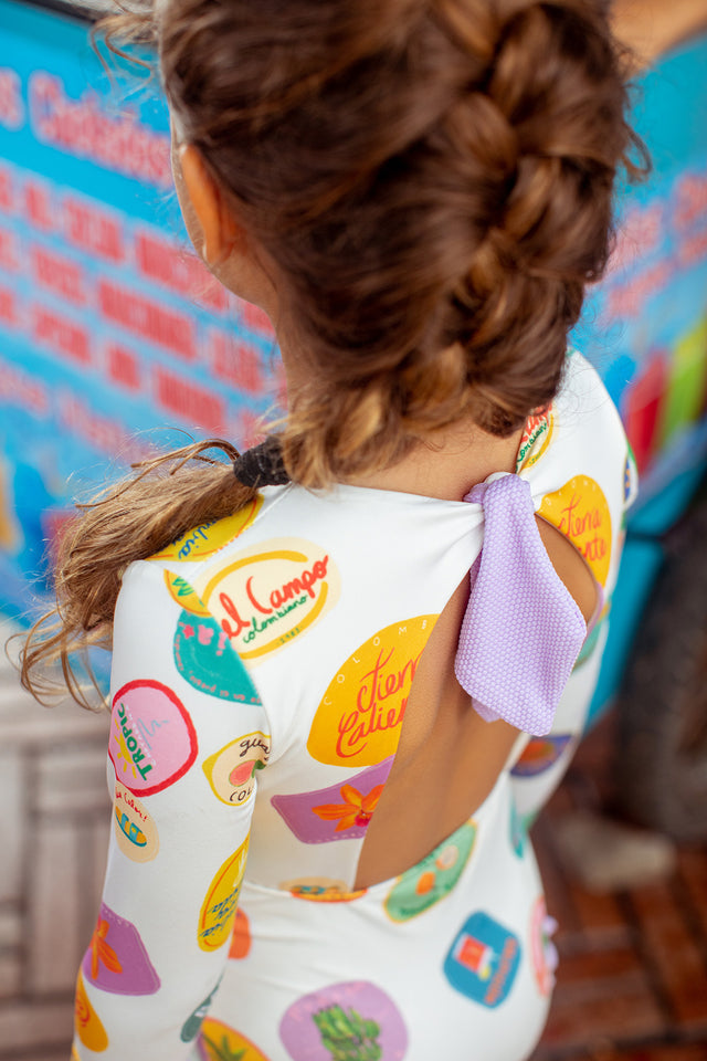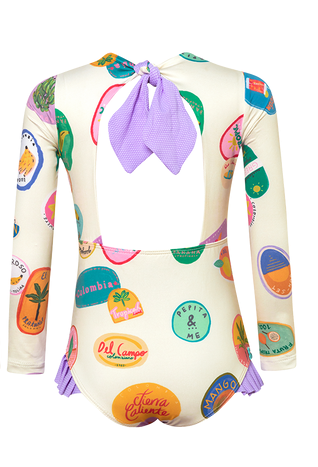 Long sleeve one-piece swimsuit for sun protection, back tie and ruffles on the contour of the leg.The fabric has UPF50+ protection factor which means that it acts as a protective shield against the sun’s UV rays. Made in Colombia.