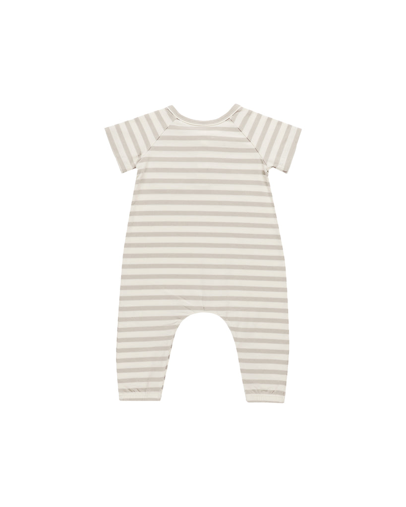 Velvety soft short sleeve jumpsuit with coconut buttons down the chest and small detail pocket at the front. Also includes hidden snaps along the inseam for easy changing.