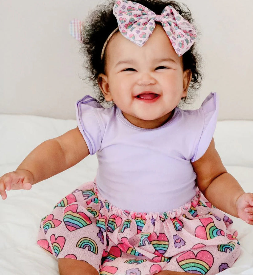 The Rainbow Heart Short Sleeve Tutu Bodysuit is a fun and trendy bodysuit for babies to welcome Spring!