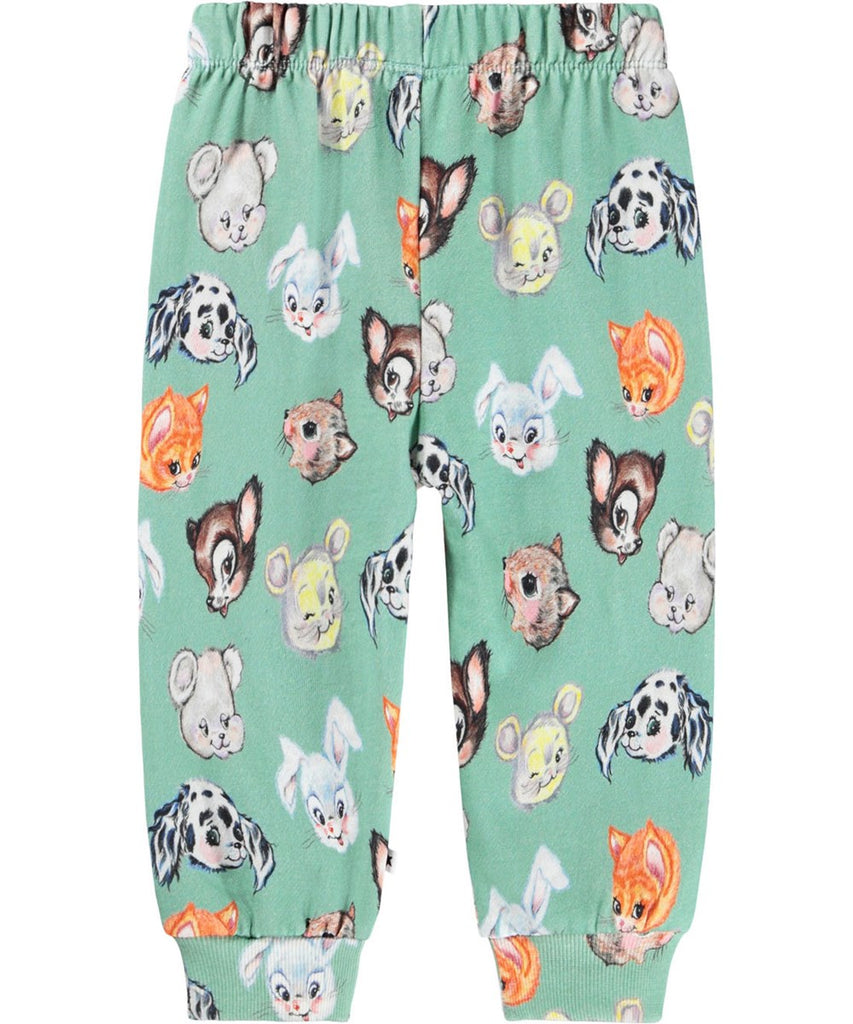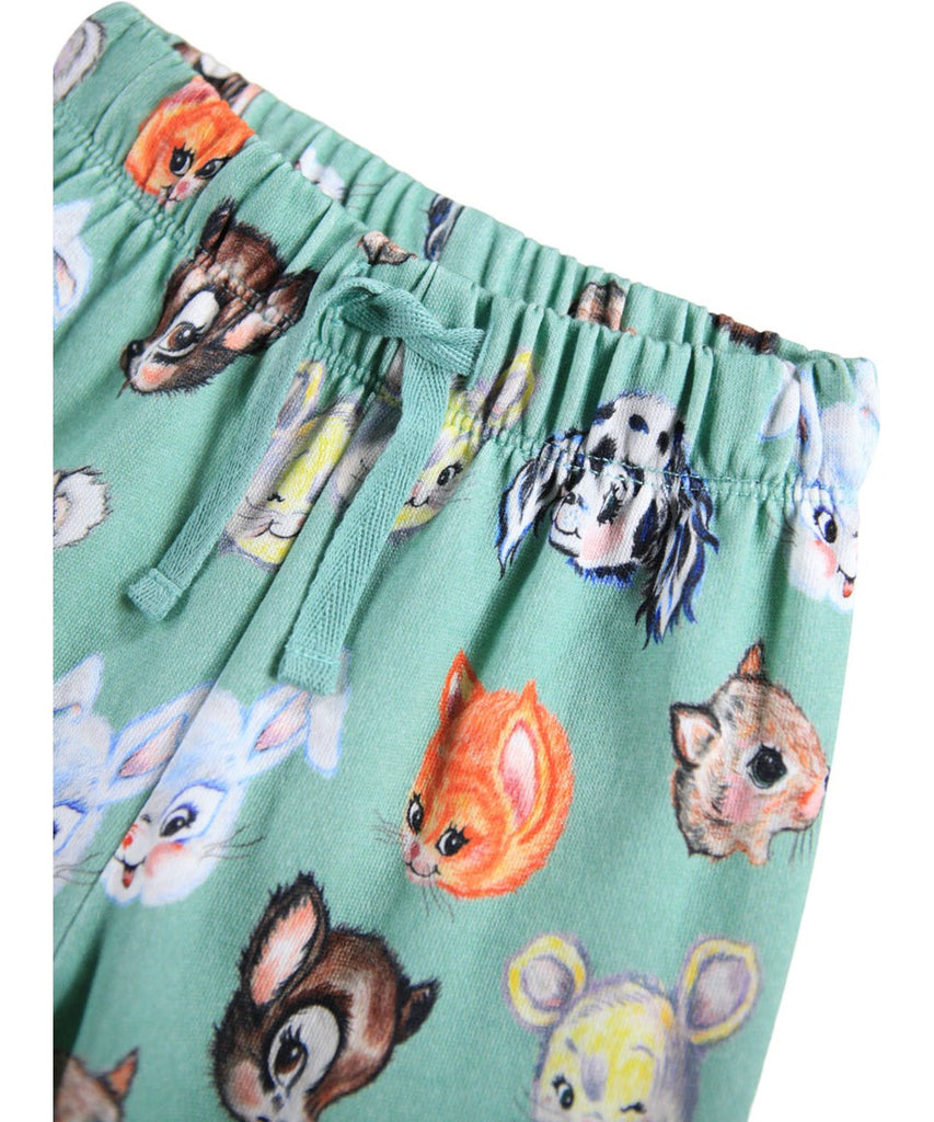 Soft organic cotton pants for the little ones. The pants are green with a print of drawn animals. The pants have elastic and a drawstring at the waist and ribbed cuffs at ankles. They are easy to take off and put on and provide plenty of space to move.