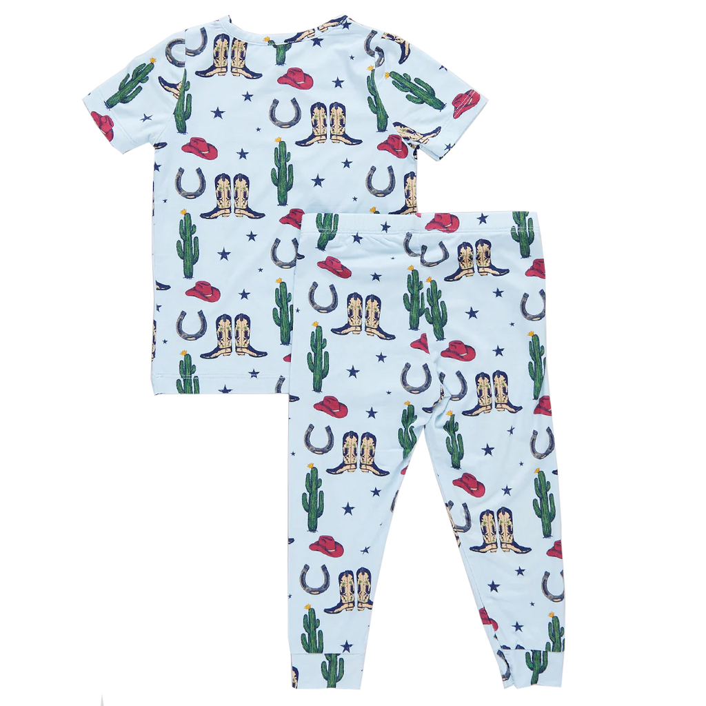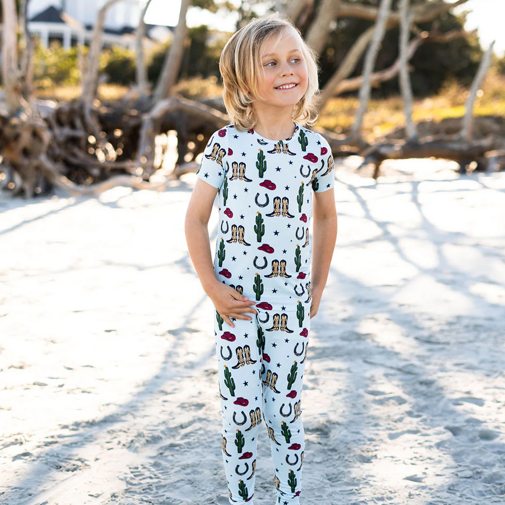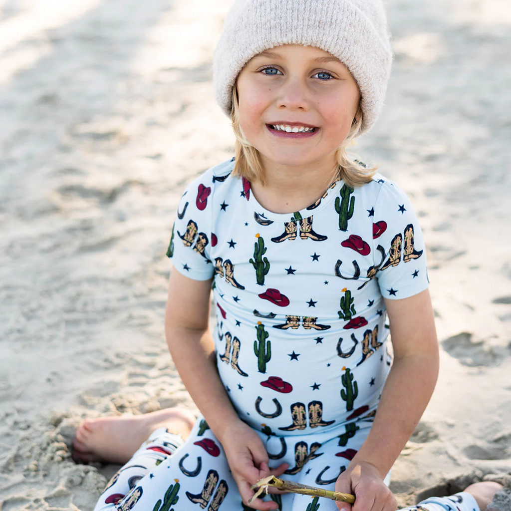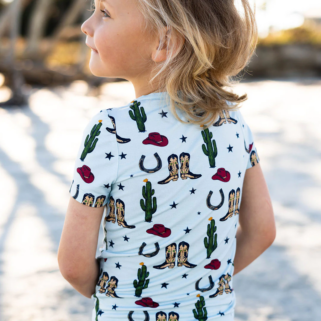 Yeehaw! Wrangle your little ones for bedtime in our Tiny Rodeo print featured on our Kids Bamboo PJ Set. Lucky horseshoes, red cowboy hats, boots and cacti pop off a blue ground on these PJs that are crazy soft with a smooth, silk-like texture. Bamboo is breathable and it keeps littles cool & comfortable in the summer and warm & cozy in the winter.