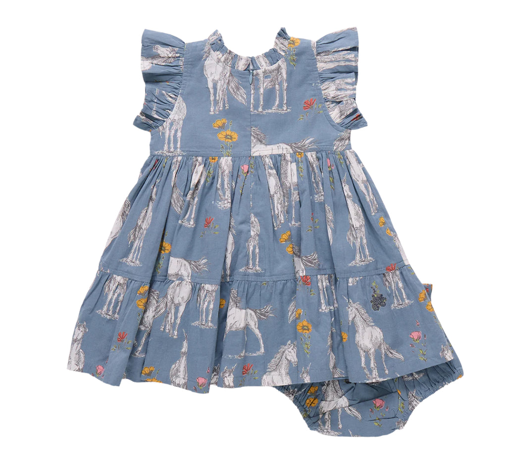 Majestic and Mythical! Our favorite legendary horses pose, tail and manes aflutter, among a scattering of wildflowers in our magical Unicorn Field print, shown here on our Baby Girls Jennifer Dress Set. A sweet ruffled neckline and sleeves and an extra twirly fully-lined skirt will inspire hours of creative play. Invisible zipper at back. The matching elastic waist diaper cover cover features a coordinated fixed navy satin bow at the waist.