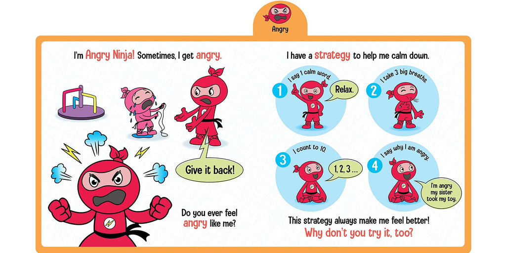 Inside you’ll find a Ninja experiencing every mood—from Angry to Positive and everything in between—and helping children navigate a sometimes frustrating world. Colorful tabs on each page help little hands navigate the book and the emotions held inside.