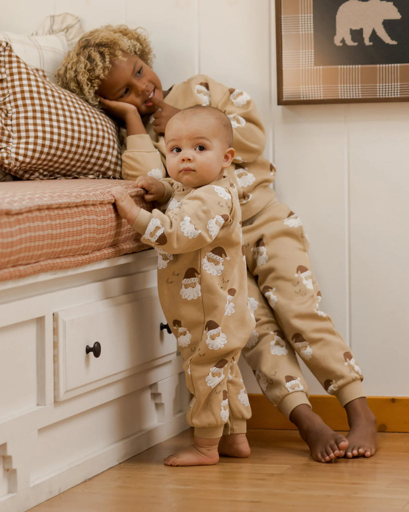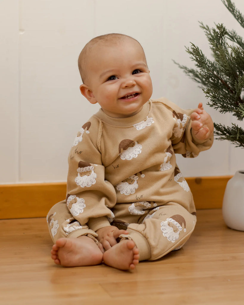 Get cozy this holiday season with our Santa Raglan Jumpsuit! Made from the softest French terry fabric, this longsleeve bubble romper features elastic leg openings and bottom snap closures for easy changing. And with our playful 'santa' pattern on gold, you'll be the life of the party. Machine washable for convenience. Made of 80% cotton and 20% polyester.