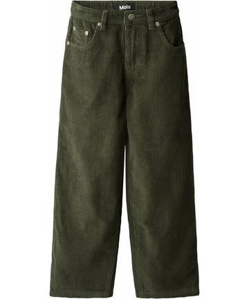 Dark Forrest pants made of ribbed corduroy with five pockets, wide legs and zip fly. The pants are inspired by the skateboarding scene and have a relaxed, loose fit.