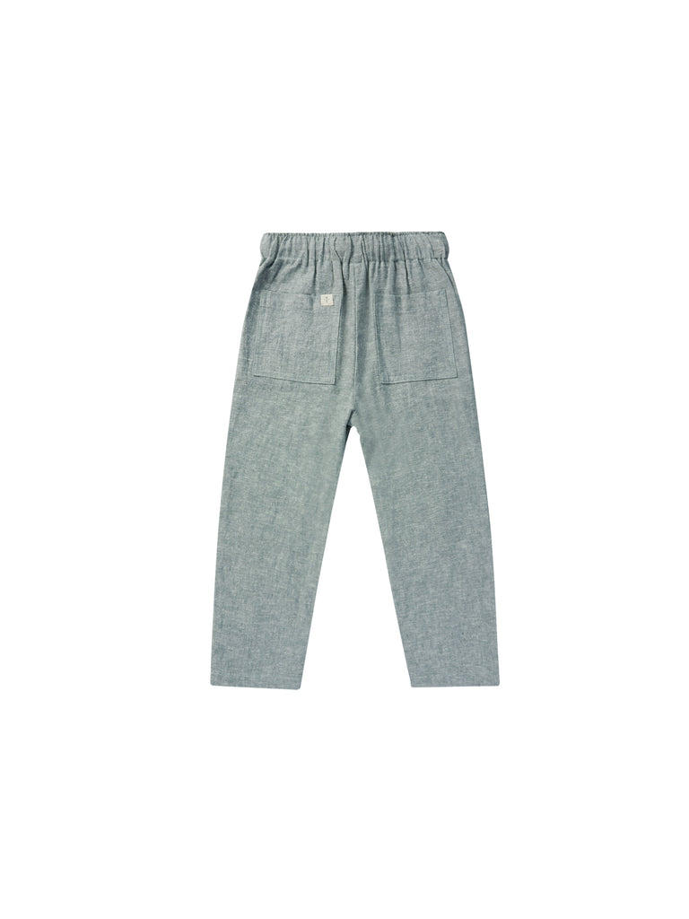A classic pant with an elastic waist, functional drawstrings, button and zipper closure and two back pockets.