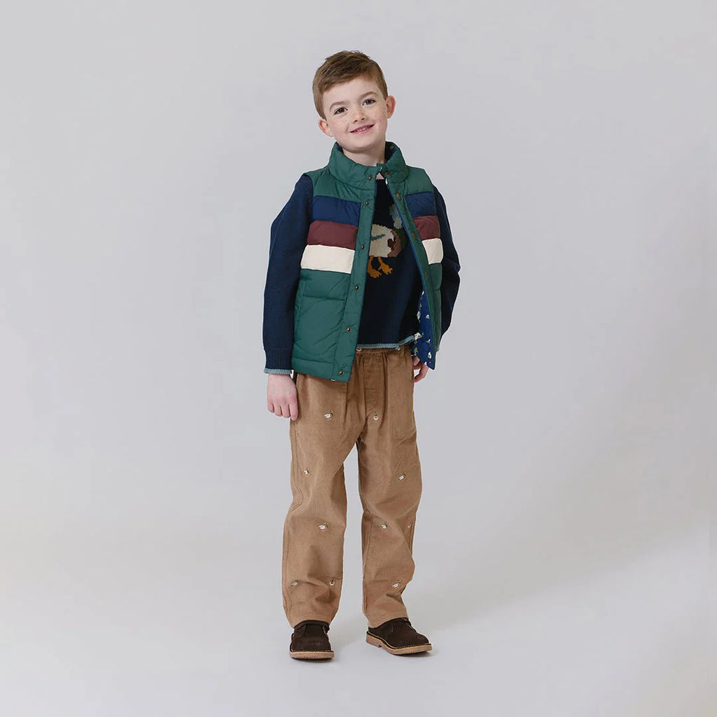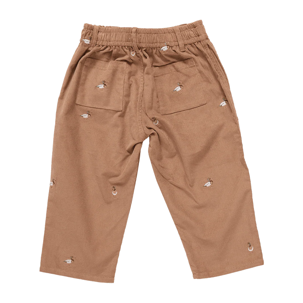 Dapper Ducks! Our Fall favorite Boys Jackson Pant is crafted in a sturdy fine wale tan corduroy and embroidered with a flock of handsome mallards, and is perfect for school pictures and fall dances. This versatile elastic waist, pull-on pant features a faux button closure, belt loops and both side and back pockets perfectly sized for marbles, matchbox cars and more.