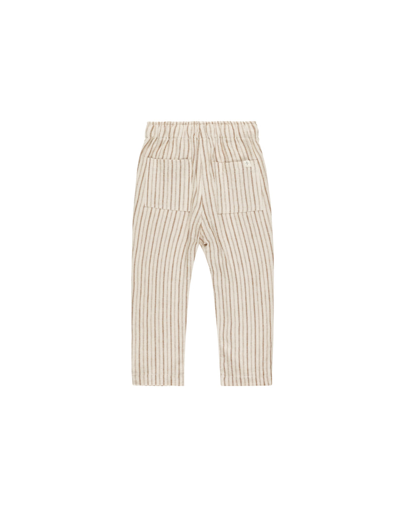 A classic pant with an elastic waist, functional drawstrings, button and zipper closure and two back pockets.