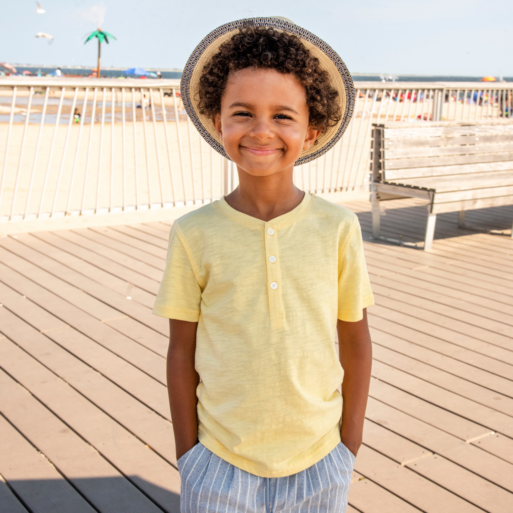 The perfect lightweight shirt for a nice dinner or event! This 100% cotton henley is a casual staple for any little ones wardrobe! Great to layer with a suit to dress it up, or with resort pants alone!