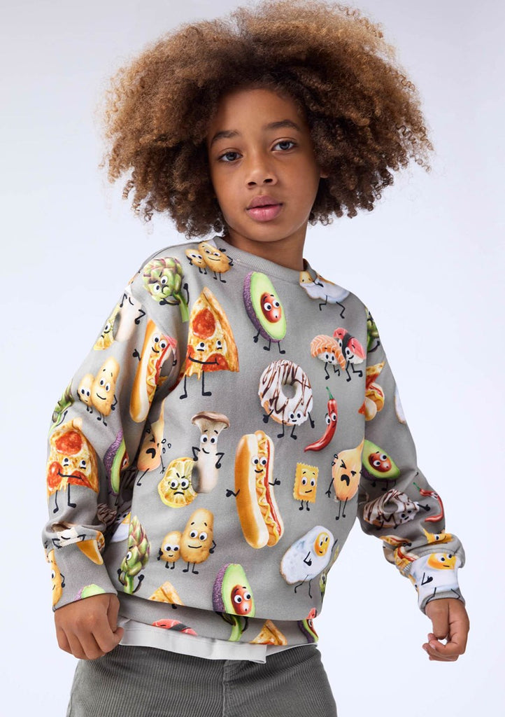 Grey sweatshirt made of soft organic cotton with ribbed edges around the neck, sleeves and waist . The sweatshirt has a regular fit and a print of food with faces.