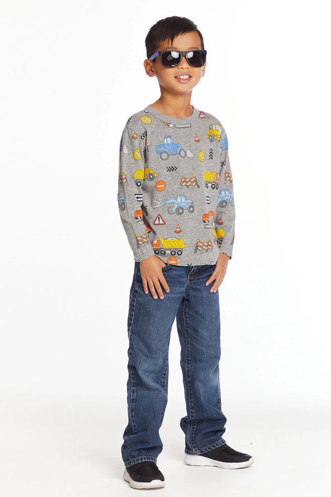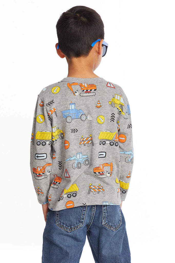 Every kid loves a construction zone, and with this long sleeve tee he can take his on the go. With diggers, excavators, and more, it’s the perfect playground conversation starter—what’s your favorite machine? Printed on the softest gray long sleeve, it’s a look your mini engineer will love.