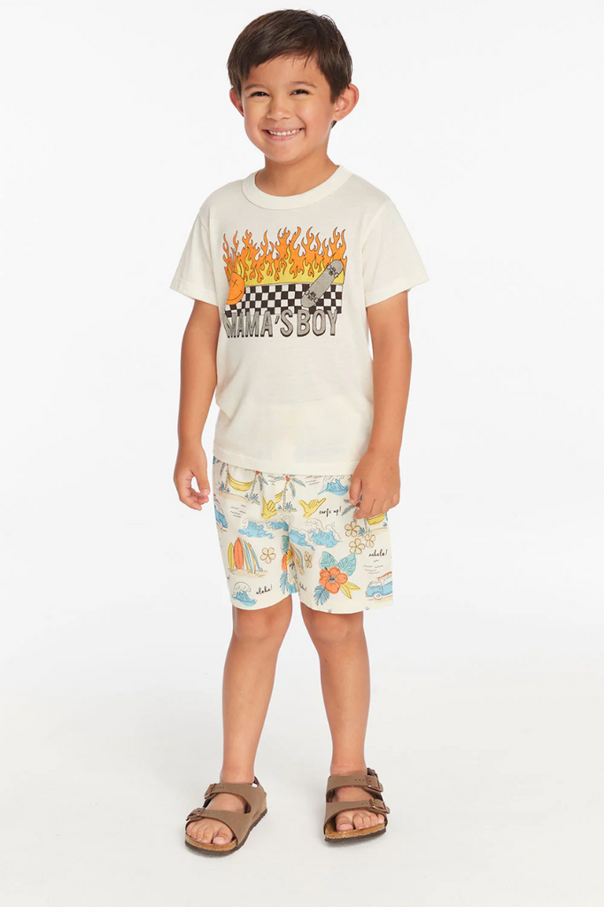 Get ready to show off your little guy's playful side with our Mamas Boy Tee! Made with a soft polyester cotton rayon blend, this tee features a fun graphic of flames, checker blocks, and the words "mama's boy" underneath. Perfect for pairing with his favorite cutoff shorts and sneakers for a cool and quirky look. Make mom proud and get ready to rock this tee! 🤘👦🔥👟