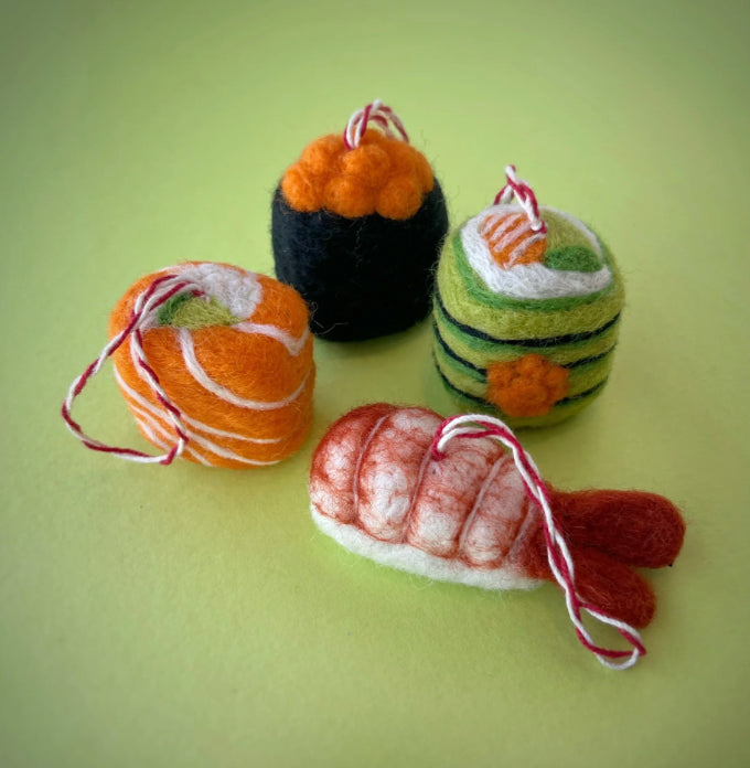 Our NEW Sushi Ornament Set looks good enough to eat! This whimsical felt sushi will spice up your tree. Our felt wool ornaments are handmade by artisans in Nepal, Asia using colorful sheep wool. Popular for their charming and durable designs, felted ornaments are perfect for the toughest toddler or curious critter.