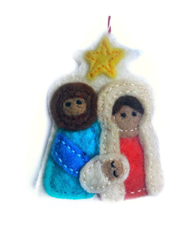 All is calm and bright on this first Christmas night! Our NEW Felt Wool Nativity Christmas Ornament features Mary and Joseph holding newborn baby Jesus. Each soft, flat nativity ornament is handmade by artisans in Nepal, Asia using colorful sheep wool. Popular for their charming and durable designs, felt ornaments are perfect for the toughest toddler or curious critter.
