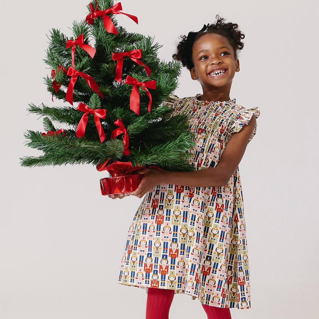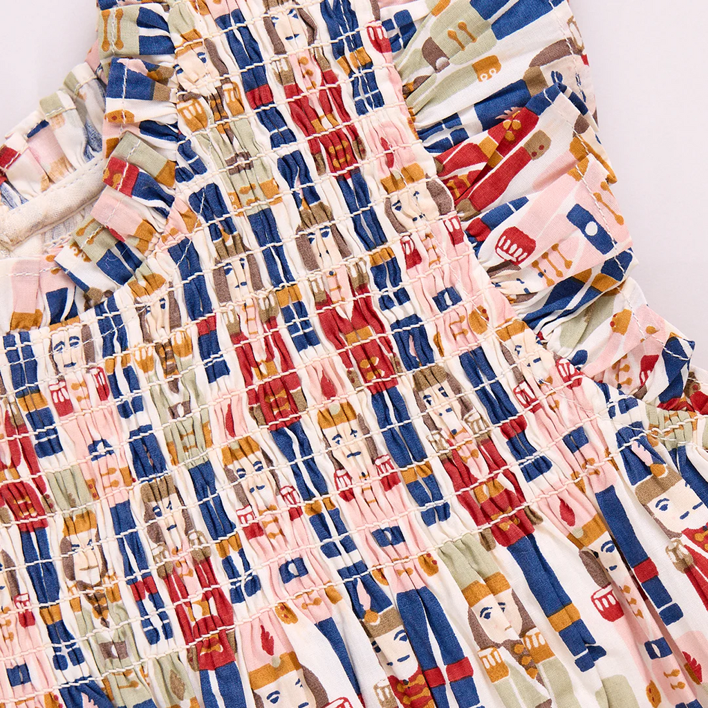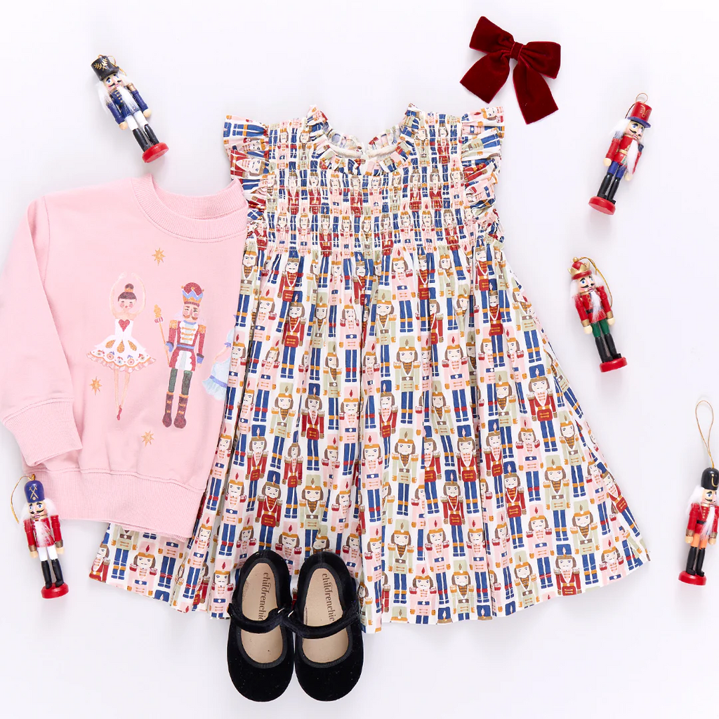A Christmastime Classic and perfect for the winter ballet - our Vintage Nutcracker novelty print shown here on our Flock Favorite Girls Stevie Dress Set is just that! This much loved silhouette boasts a fluttery ruffled arm, delicate ruffle at the neck and vintage inspired smocking at the chest. Invisible zipper closure at the back.