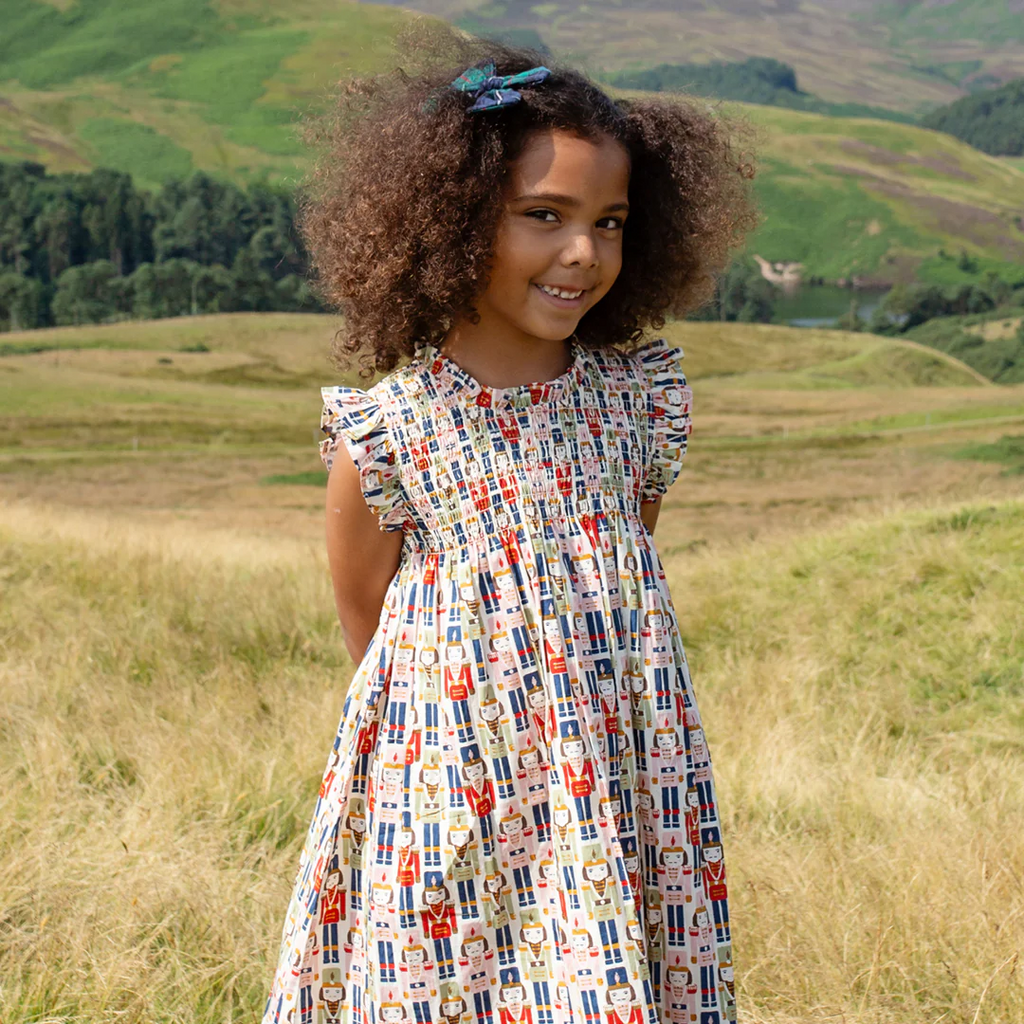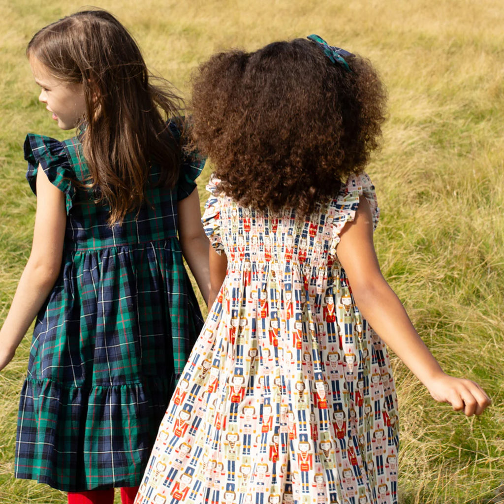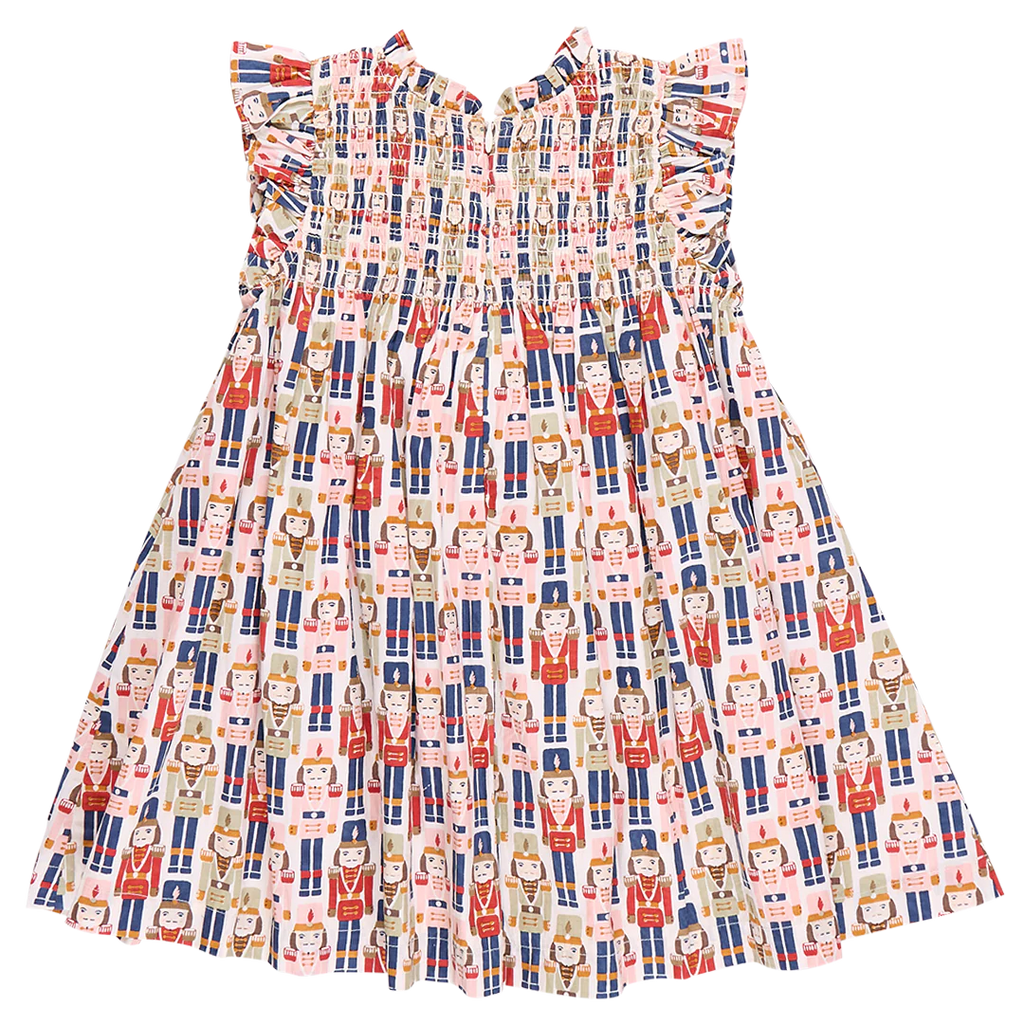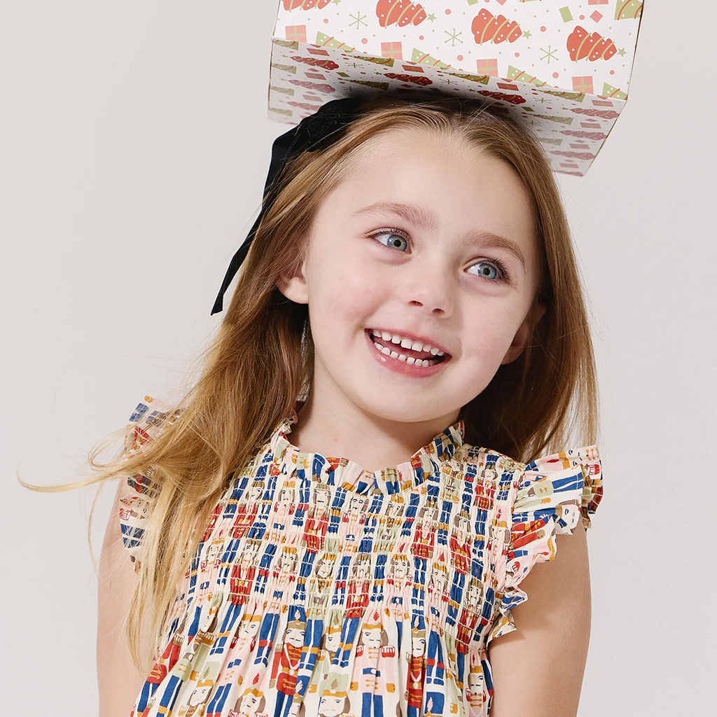 A Christmastime Classic and perfect for the winter ballet - our Vintage Nutcracker novelty print shown here on our Flock Favorite Girls Stevie Dress Set is just that! This much loved silhouette boasts a fluttery ruffled arm, delicate ruffle at the neck and vintage inspired smocking at the chest. Invisible zipper closure at the back.