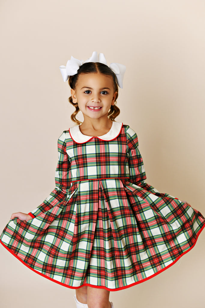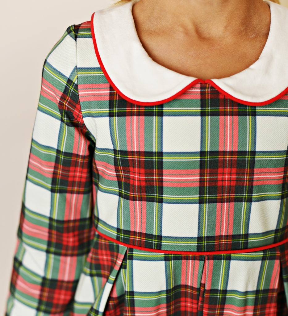 This plaid dress is perfect for all of your holiday gatherings! It has a white Peter Pan collar edged with red piping. There is red piping at the hem and the waist of this dress.