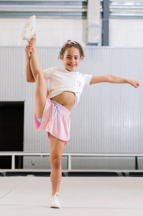 The Tatum Short is a new fly-away style in Cotton Candy Pink, designed for a fun and sporty look. Featuring Cotton Candy Blue biker shorts and a matching tie, this set offers both style and comfort, making it perfect for active days and playtime adventures.