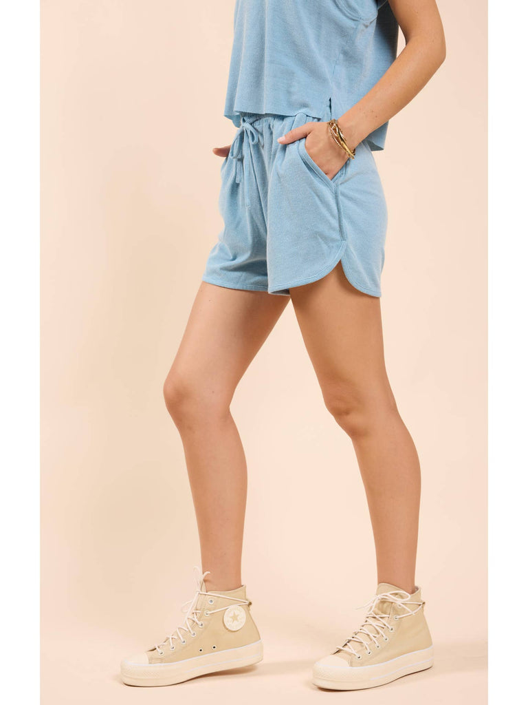 This short has side pockets with a jogger short profile and an elasticized waistband. The fabric has a small waffle weave texture. (Picture shows a tie at the waist, but the tie was not manufactured on this item.)