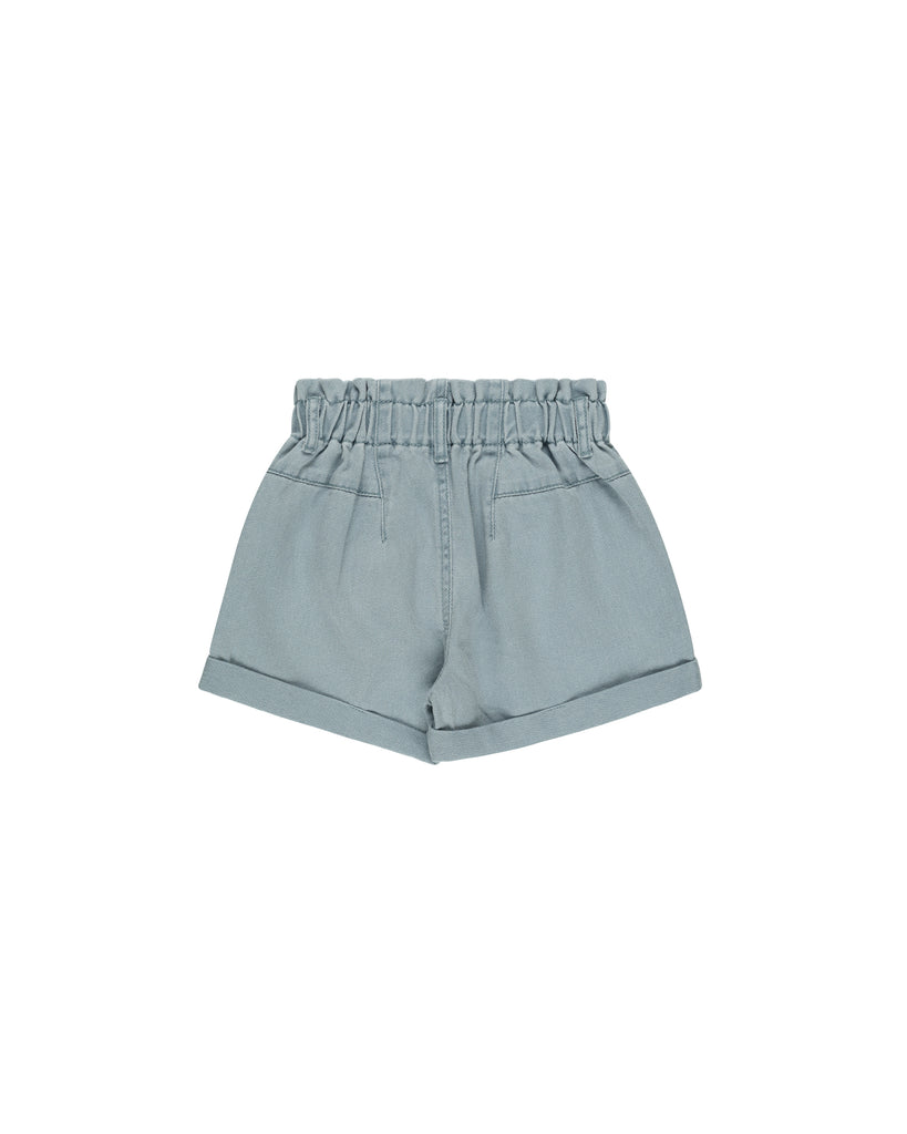 Lightweight denim shorts with a gathered elastic waistband, front patch pockets, a fixed cuff hem, belt loops, and cute button snap.